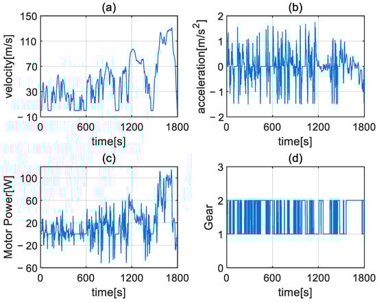Driving cycle of WLTC: (a) vehicle speed; (b) vehicle acceleration; (c) drive motor power; (d) selected gear of 2AMT.