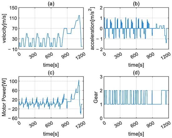 Motor power consumption and correspond to Gear 1 and Gear 2, respectively. During real-time operation, the optimal gear is determined by referring to the gear selection map in Figure 3. For example, Gear 1 is selected at a wheel acceleration of and vehicle speed of , while Gear 2 is chosen at and .