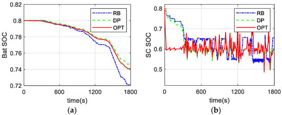 In order to have a more intuitive comparison of the control effect, Figure 11 shows the change in battery SOC and supercapacitor SOC. Figure 11b shows that all three strategies can keep the supercapacitor SOC within a reasonable range of 0.4 to 0.8. In the initial stage, all strategies prioritize the use of supercapacitors, causing their SOC to drop rapidly from 0.8 to 0.6; then, the battery begins to play a major role. The supercapacitor is prioritized for charging in the braking stage. Under the RB strategy, the battery SOC continuously decreases slowly and reaches a final value, which is the lowest among the three, indicating the highest battery energy consumption; the battery SOC curves of DP and OPT are very similar, demonstrating a higher overall energy efficiency. The proposed control strategy not only reduces energy losses but also mitigates battery stress, as evidenced by the smoother battery power output shown in Figure 9 and the stable SOC profiles of both the battery and supercapacitor shown in Figure 11.