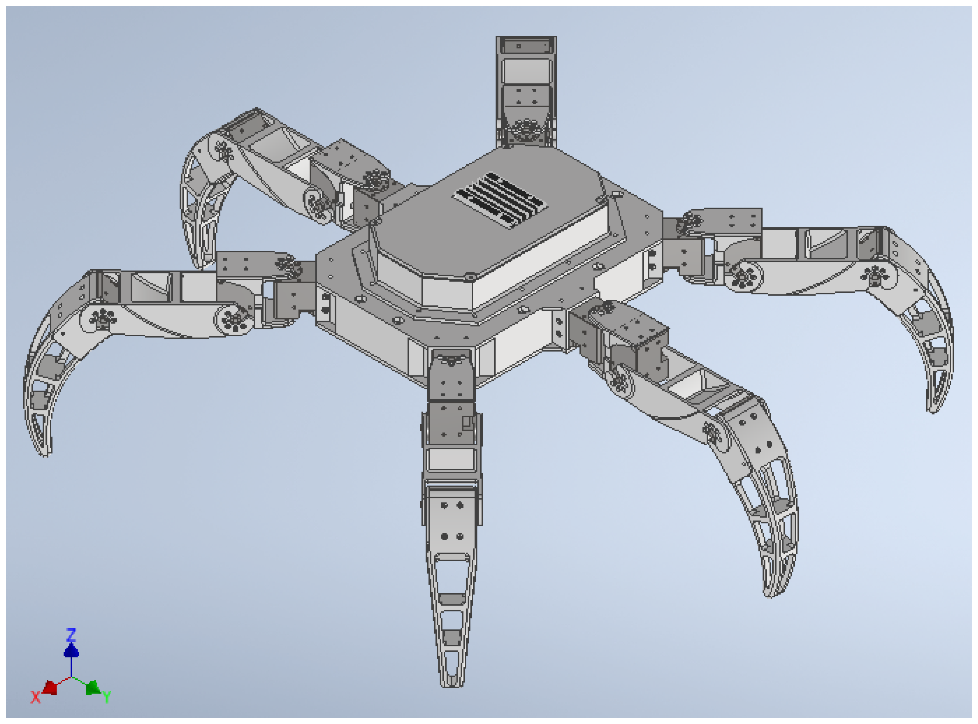 Figure 1 shows the external appearance of the physical hexapod robot used in this work, and its overall leg arrangement and structural characteristics can be observed.