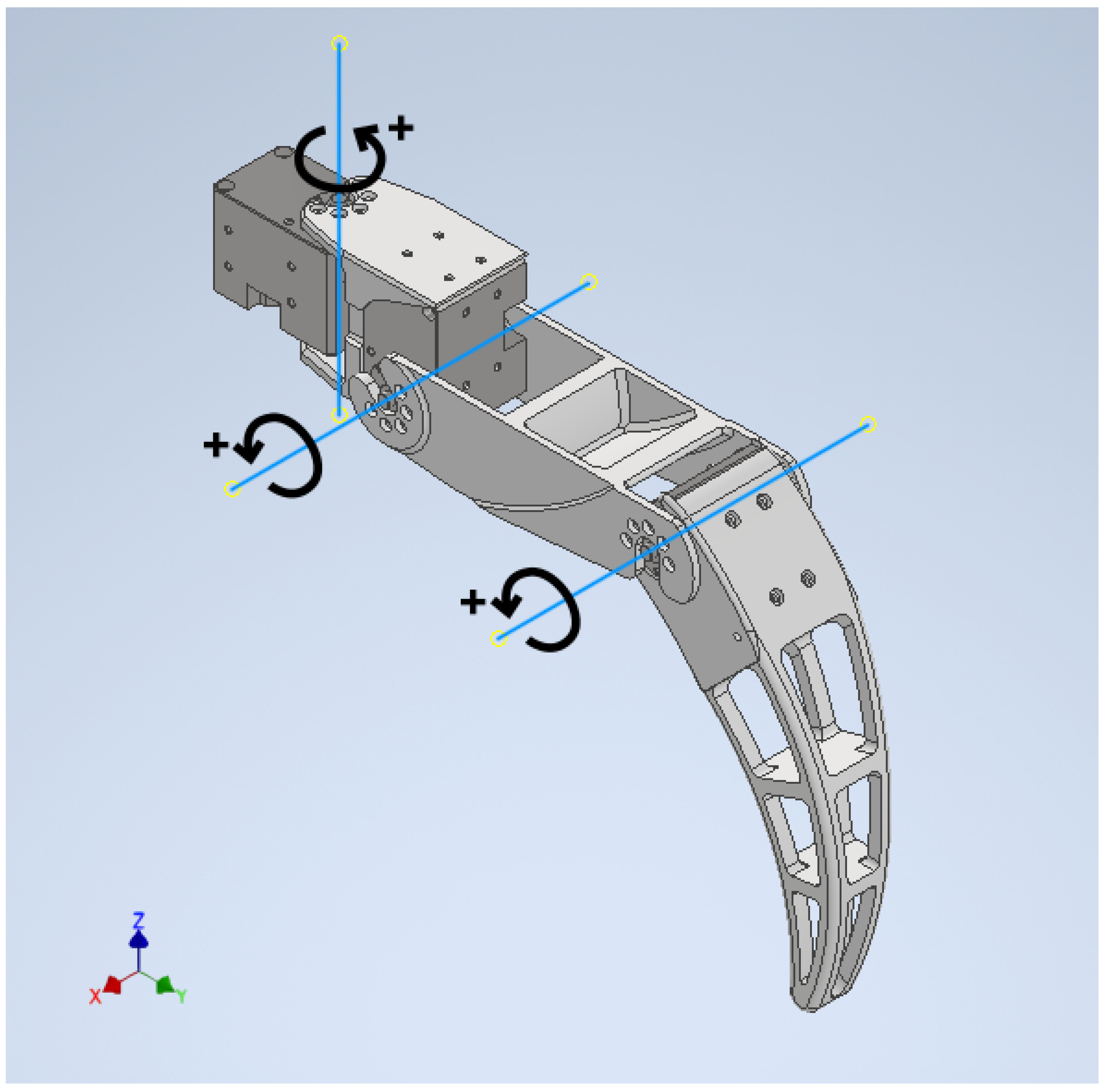 Figure 2 illustrates the configuration and rotation directions of the three joints in a single leg, and the joints correspond, in order, to the base, shoulder, and elbow.
