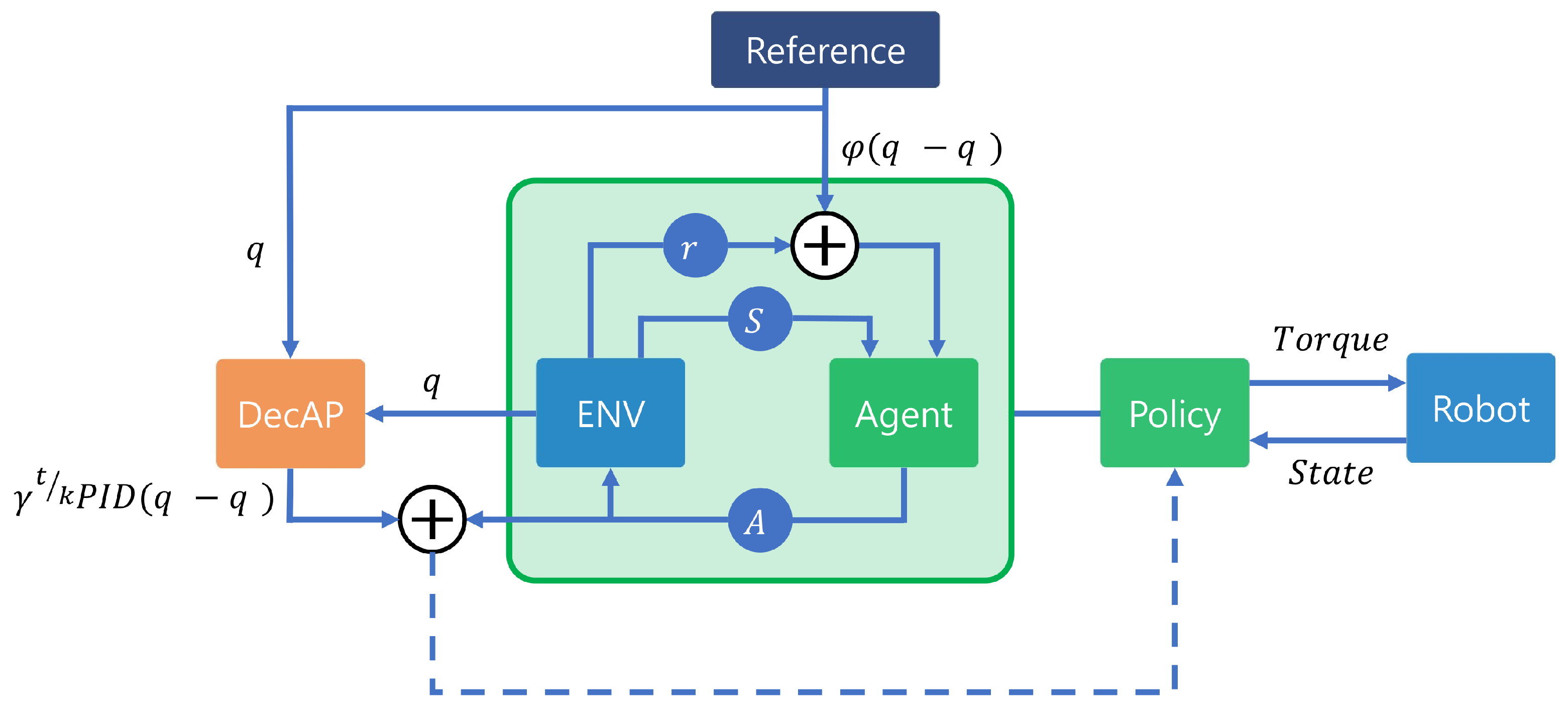This PD term acts as an approximate torque that imitates the commanded motion and provides a physically meaningful initialization for torque exploration. The final torque sent to the motors is blended with the policy torque according to the DecAP decay rule: