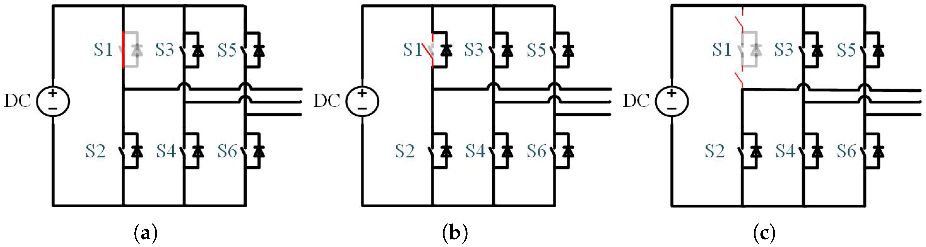 Figure 1b), only the negative half-cycle conducts (through the diode). The positive half-cycle is entirely missing; the other phases’ currents increase, and there would be a pronounced downward DC offset. Finally, if both the switch and its parallel diode fail as open (a true open-switch fault presented in