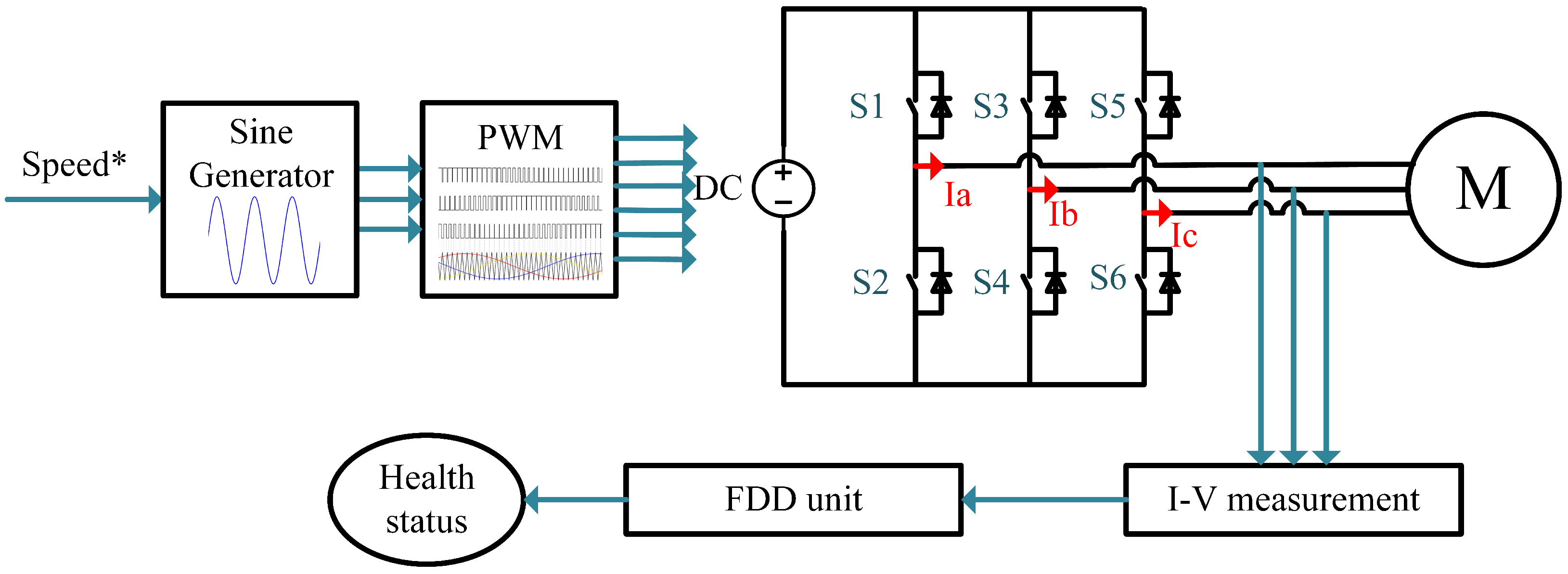 9]. Model-based methods rely on accurate mathematical representations of the drive to generate residuals, with deviations between predicted and measured values serving as fault indicators. Signal-based techniques extract diagnostic features, whether in the time, frequency, or time--frequency domain, from measured waveforms and apply threshold-based decision rules to detect anomalies.