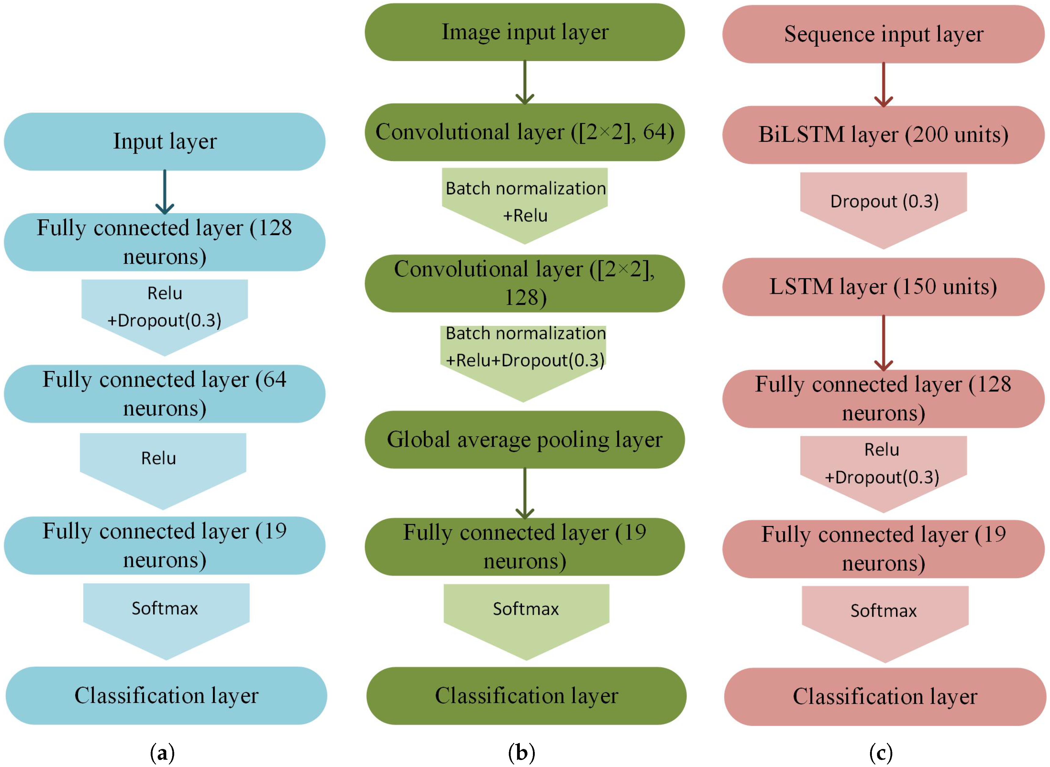 The second classifier leveraged a convolutional neural network (CNN) to exploit spatial correlations in the extracted features. First, the 12-dimensional feature vector at each time step was reformatted into a 3 × 4 image, keeping the correlations between features, and then fed into an image input layer. This was followed by three convolutional blocks, each consisting of the following: