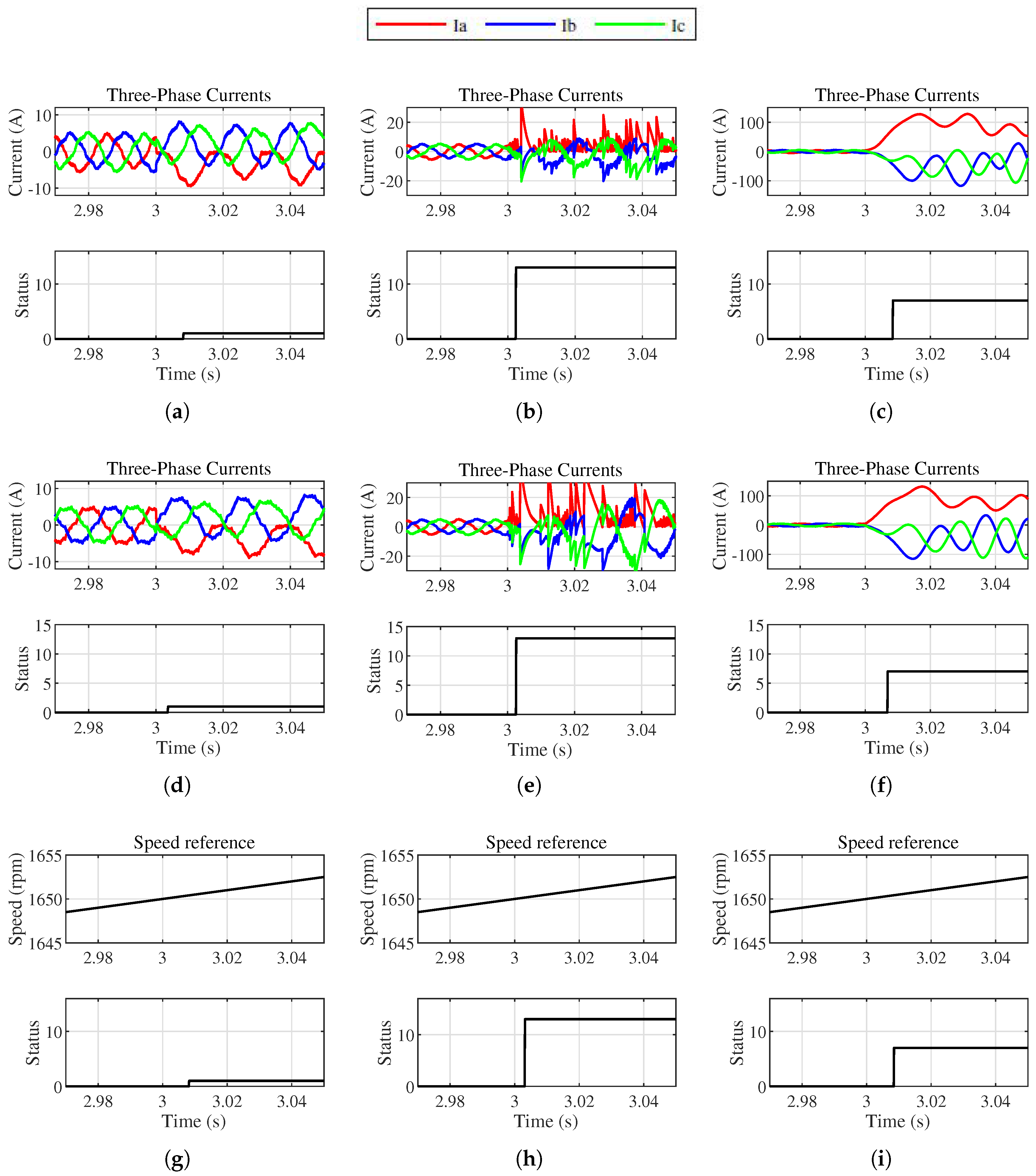 Fault detection using proposed BiLSTM FDD. When at t = 3, the S1 switch experiences the following faults: (a) OG at 1800 rpm, (b) OS at 1800 rpm, (c) SC at 1800 rpm, (d) OG at 1400 rpm, (e) OS at 1400 rpm, (f) SC at 1400 rpm, (g) OG during speed variation, (h) OS during speed variations, and (i) SC during speed variation.