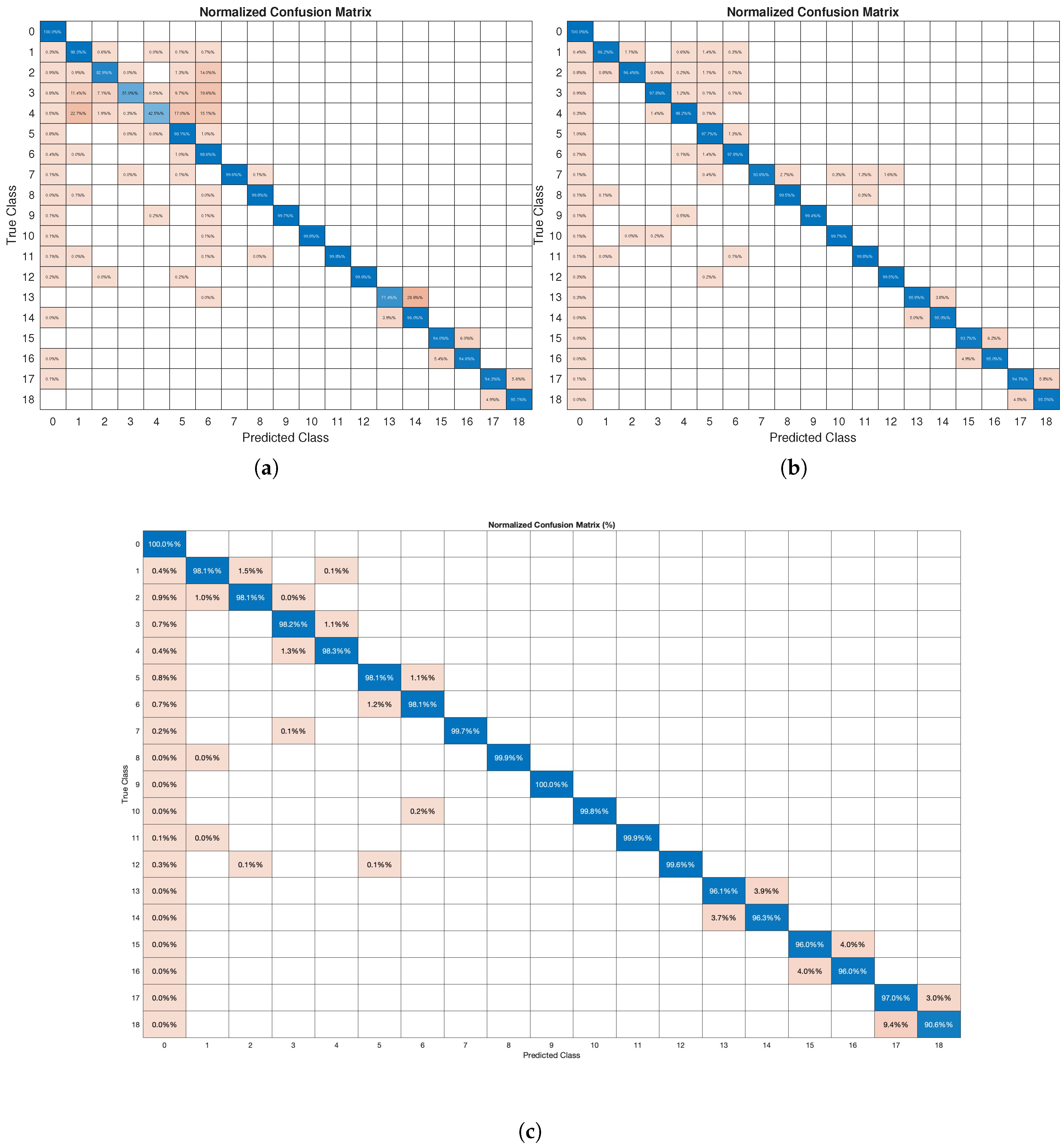 Normalized confusion matrix for the following: (a) FCN model, (b) CNN model, and (c) BiLSTM model (blue shows the correct and orange shows wrong classification).