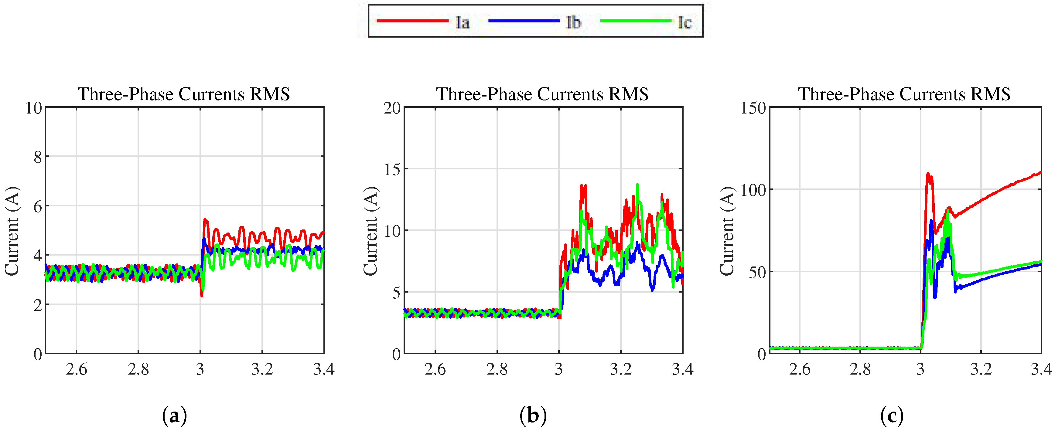 Figure 9 shows how the three-phase currents RMS values are changed when OG, OS, and SC faults occur in switch S1.