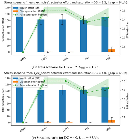 This work addresses this gap by performing an actuator-centric analysis of five representative closed-loop designs: NMPC, linear MPC, adaptive MPC, PID, and LQR. Three complementary scenarios are considered. The first combines meal disturbances, exercise-driven glucose uptake, and stochastic sensor noise to generate physiologically realistic variability. The second investigates actuator saturation by exposing controllers to aggressive disturbances capable of driving infusion toward magnitude and rate limits [