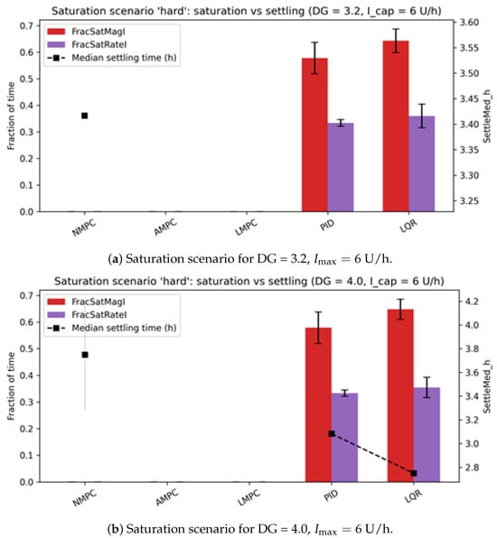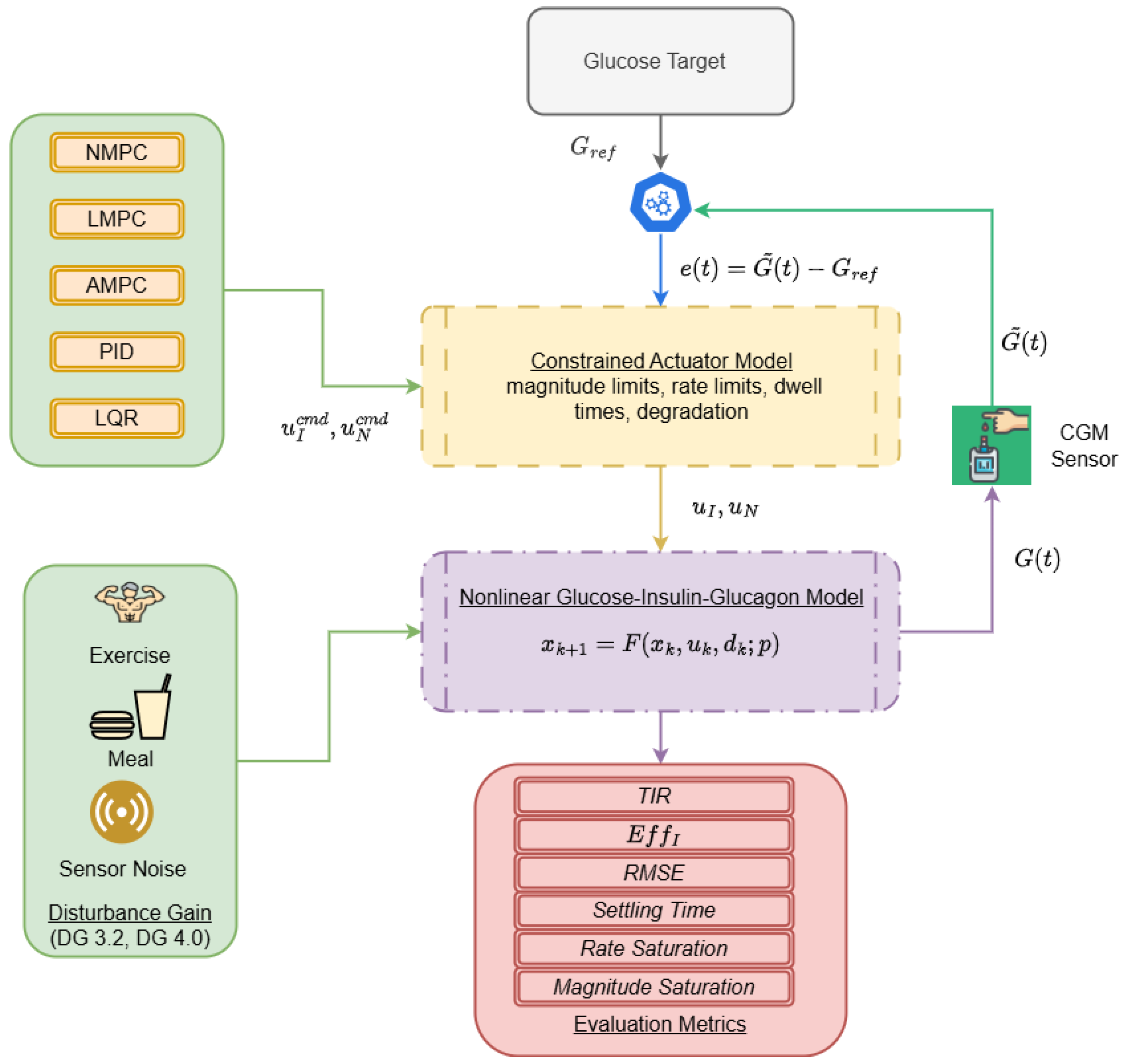 6]. Under these conditions, standard glycemic metrics may not fully reflect differences in how controllers utilize actuator capacity, manage rate limits, or respond to saturation effects. However, many of these investigations consider scenarios in which the actuators operate comfortably within their physical limits. Under such conditions, clinically relevant metrics may mask important differences in actuator solicitation, rate-limit utilization, or delays induced by saturation. When the actuator becomes the dominant constraint, controller rankings can shift, and more subtle behavior related to actuation efficiency, smoothness, and robustness emerges.