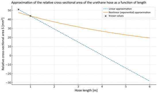 The cross-sectional area is specified for polyurethane pneumatic tubing with an outer diameter of 12 mm and an inner diameter of 9 mm. Values were given for hose lengths of 0.5 m and 1 m; by approximating these known data, the relative cross-sectional area for a length of 1.5 m was determined to be 38.5 mm2. This value was obtained from the reference graph correlating hose length with flow capacity Figure 6. Due to the limited number of reference points, the resulting fit should be understood as an approximate relationship used primarily to preserve parameter continuity in the subsequent flow modelling. Although additional intermediate measurements were not available, the assumed linear trend is consistent with empirical behaviour of pneumatic hoses documented in the literature. Nevertheless, the restricted dataset may introduce a minor deviation in the predicted distributed resistance, which is acknowledged as a limitation of the present analysis.