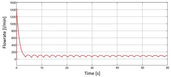 The flow rate characteristics, illustrated in Figure 17, show an initial sharp peak reaching approximately 100 L/min, representing the rapid pressurization of the pneumatic system at startup. After this transient phase, the flow rate gradually decreases and stabilizes at a steady level corresponding to the continuous nitrogen consumption by the actuators.
