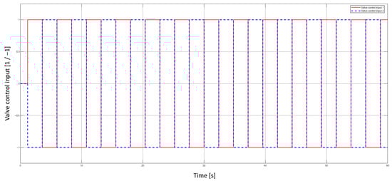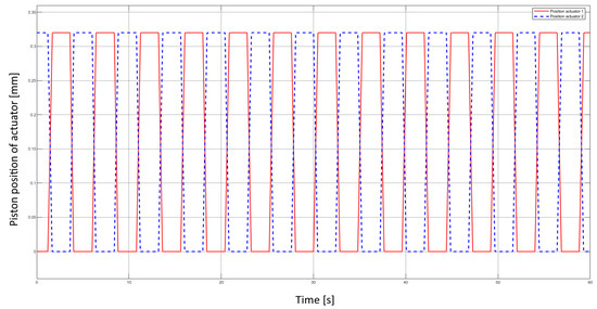 The subsequent stage of the analysis focused on the control inputs and motion response of both pneumatic actuators. Each actuator was operated by a solenoid valve receiving a discrete control signal that defined its extension or retraction phase. As illustrated in Figure 18, the input signals were set in a counter-phase operation—actuator 1 began at an initial position of 0 mm and extended upon receiving a signal value of +1, while actuator 2 started at 320 mm and retracted under a signal value of −1.