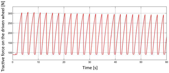 The final simulation results illustrate the overall dynamic performance of the pneumatic drive system and its mechanical interaction with the drivetrain. The plots present the total actuator forces during both extension and retraction strokes (Figure 20), which directly reflect the alternating pressure conditions within the actuator chambers. These forces were subsequently transformed through the system’s gear ratios to obtain the resulting torque acting on the differential shaft (Figure 21). The torque curve shows a characteristic oscillating pattern, corresponding to the cyclic operation of the two opposing actuators. From the calculated torque, the tractive force on the driven wheel (Figure 22) and the corresponding instantaneous and peak acceleration of the vehicle (Figure 23) were determined. These parameters describe the conversion efficiency of pneumatic energy into linear motion and provide a direct indication of the system’s ability to deliver stable propulsion. Furthermore, using the position output signals from both actuators, the rotational speeds of the intermediate shafts and the final differential output were computed (Figure 24). The gradual increase of rotational speed illustrates the transient phase of acceleration followed by a steady operating state. Integration of these rotational values yielded the total vehicle travel distance over the 60 s simulation period (Figure 25), demonstrating smooth motion without instability or undesired oscillations. Overall, these results confirm the correct functional coupling and energy transfer between the pneumatic, mechanical, and control subsystems of the developed model. The observed values and trends validate the consistency of the simulation setup and provide a solid foundation for further optimization of the Pneumobile’s performance.