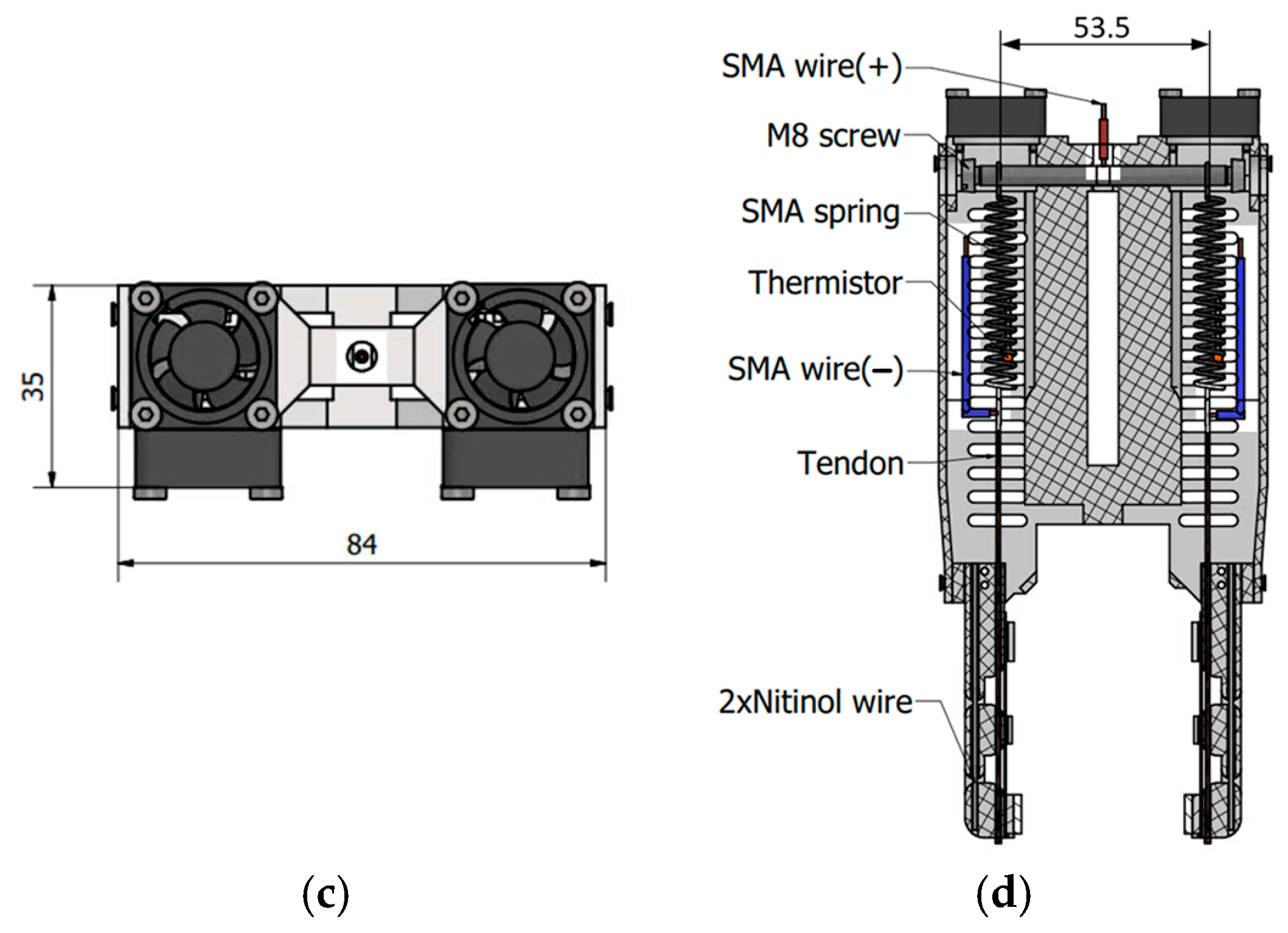 - Do, P.T.; Le, Q.N.; Luong, Q.V.; Kim, H.-H.; Park, H.-M.; Kim, Y.-J. Tendon-Driven Gripper with Variable Stiffness Joint and Water-Cooled SMA Springs. Actuators 2023, 12, 160. [Google Scholar] [CrossRef]
