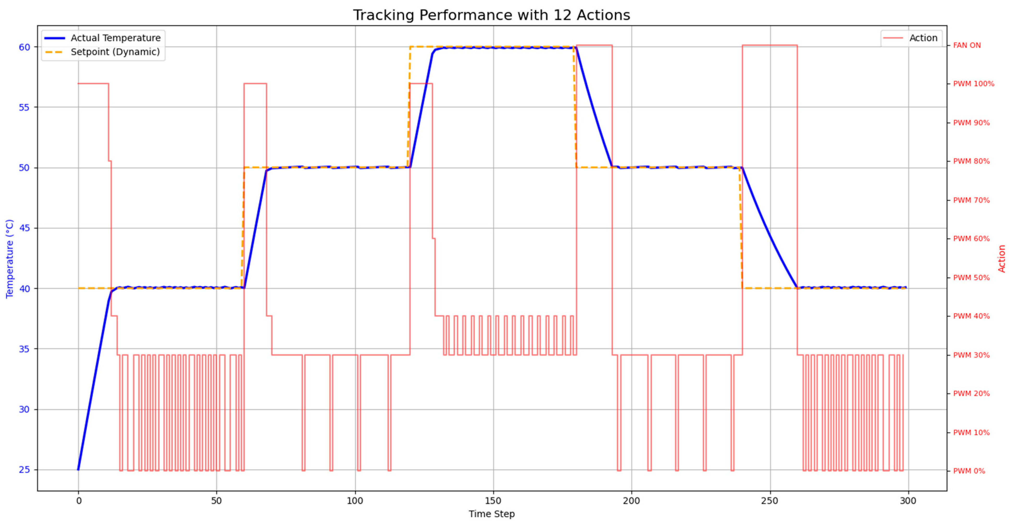 - High Stability and Smooth Control: The policy is remarkably stable once the setpoint is reached. The high-frequency oscillations or “chattering” observed in earlier training stages were successfully eliminated. The agent learned to maintain a steady temperature using low-power PWM actions, which is a direct consequence of the penalty for frequent action switching. This results in a smoother, more efficient, and more hardware-friendly control approach.