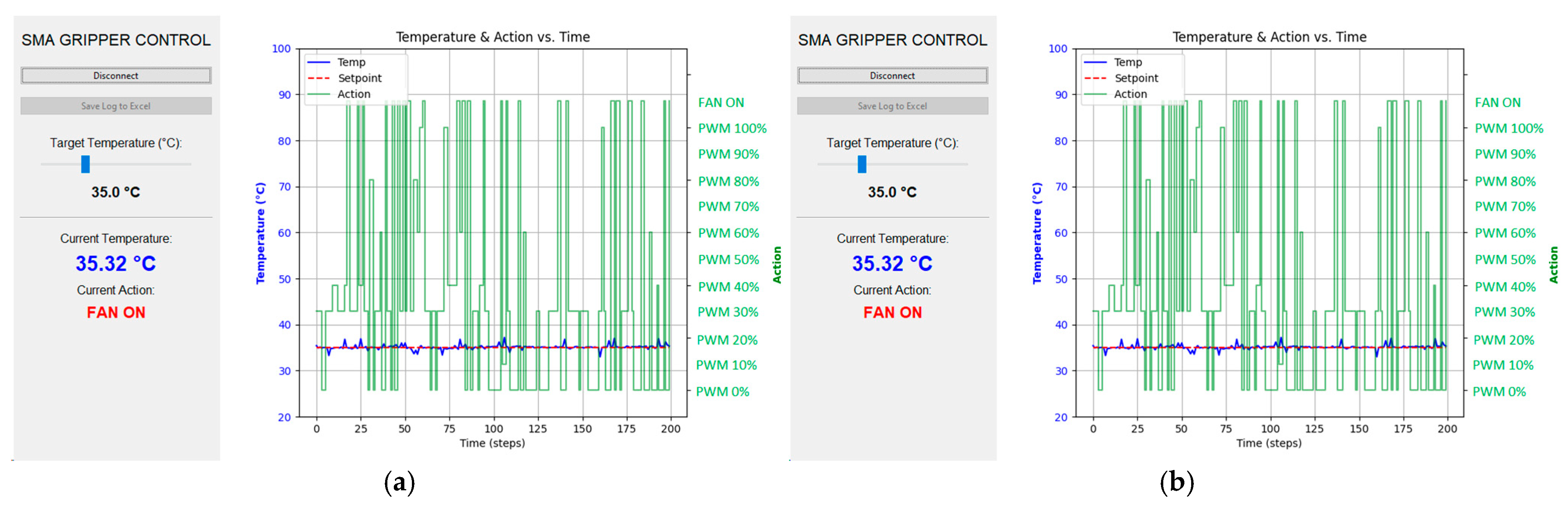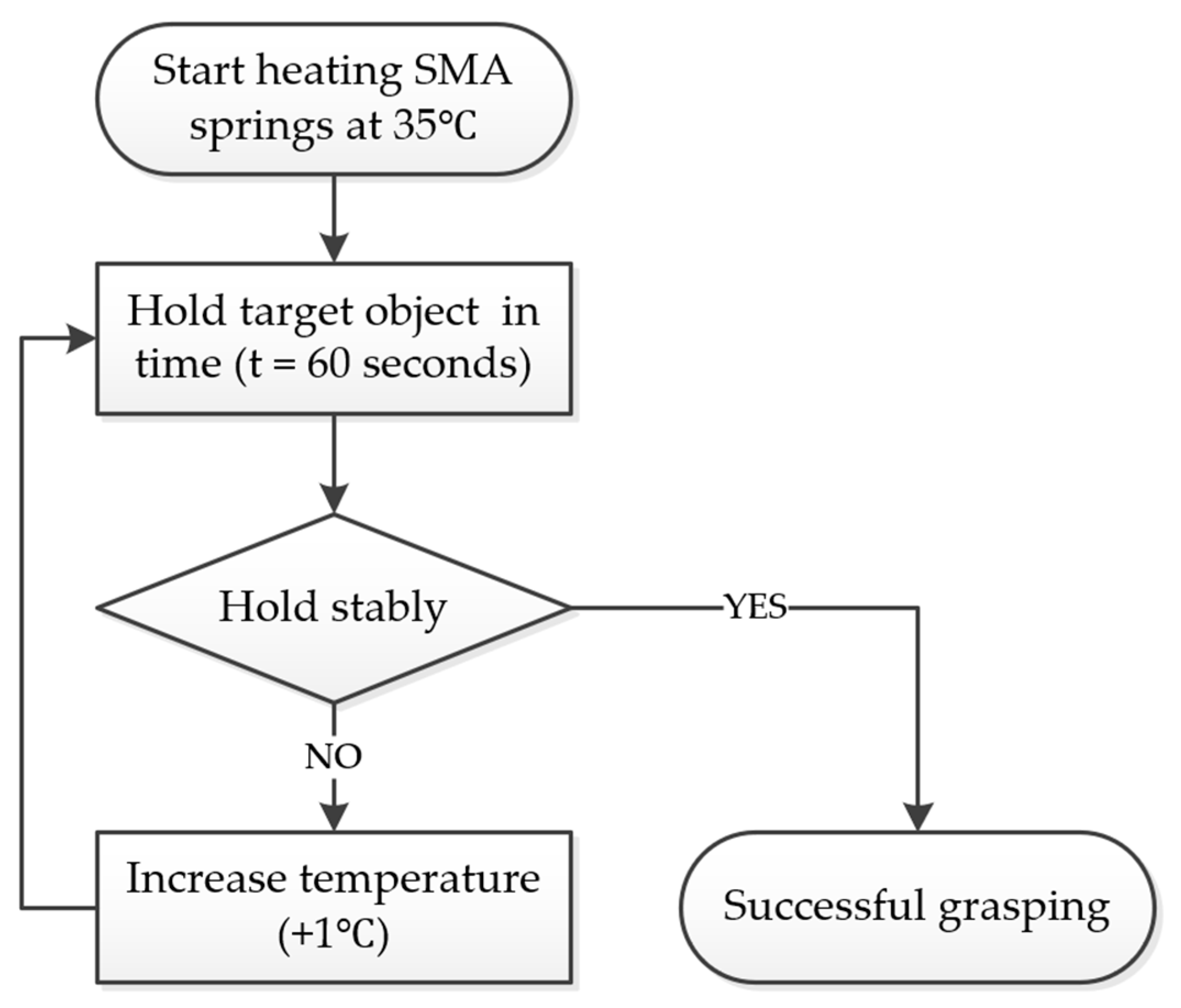 - The temperature setpoint is gradually increased from 35 °C until the gripper can securely hold the object for at least two minutes, ensuring steady-state stability.