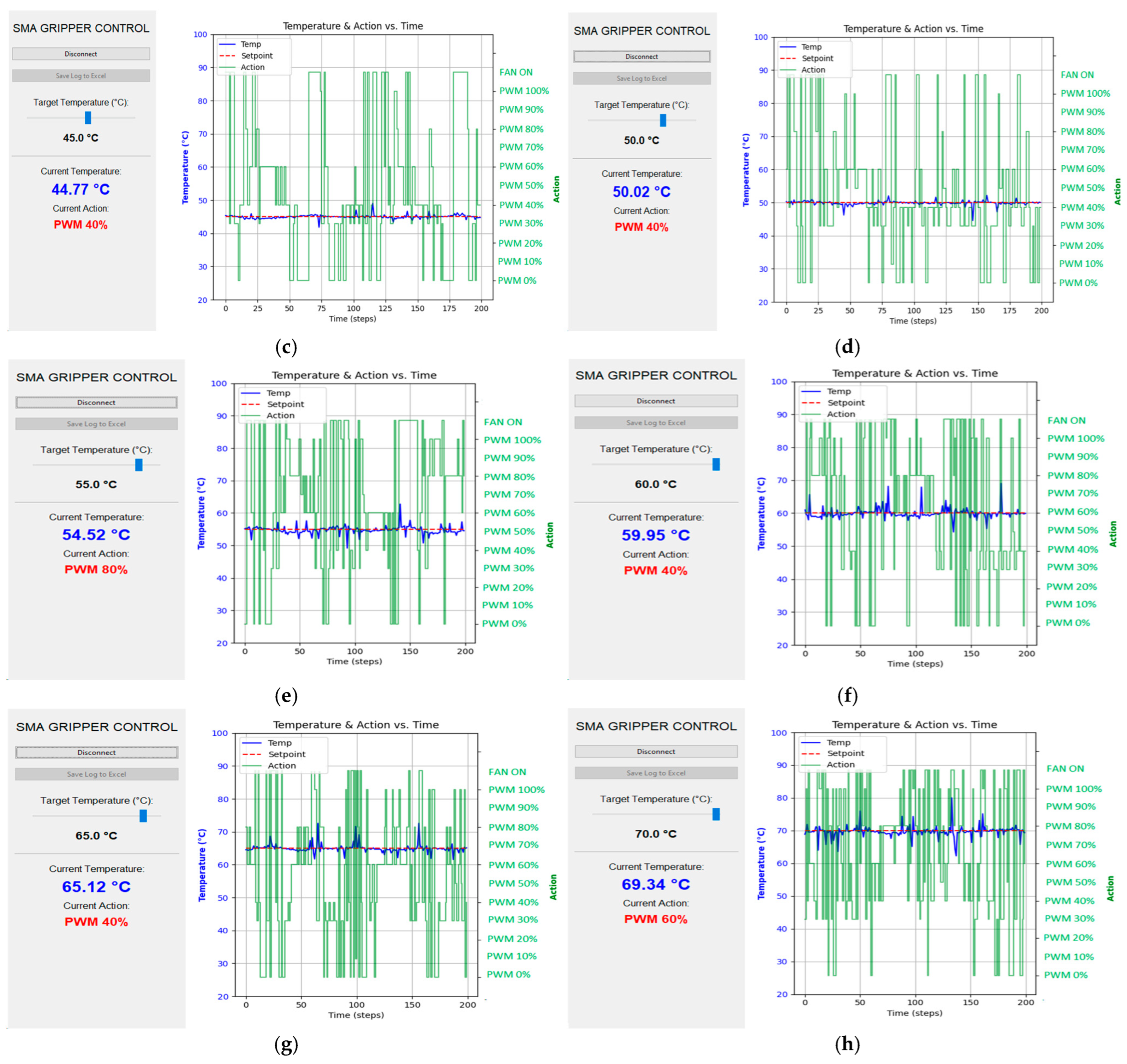 - Safety temperature zones (rsafety): To ensure the physical integrity of the SMA actuator and enforce a safe operational envelope, a high-priority safety constraint mechanism was implemented. We defined a valid operating temperature range between 25 °C and 80 °C.