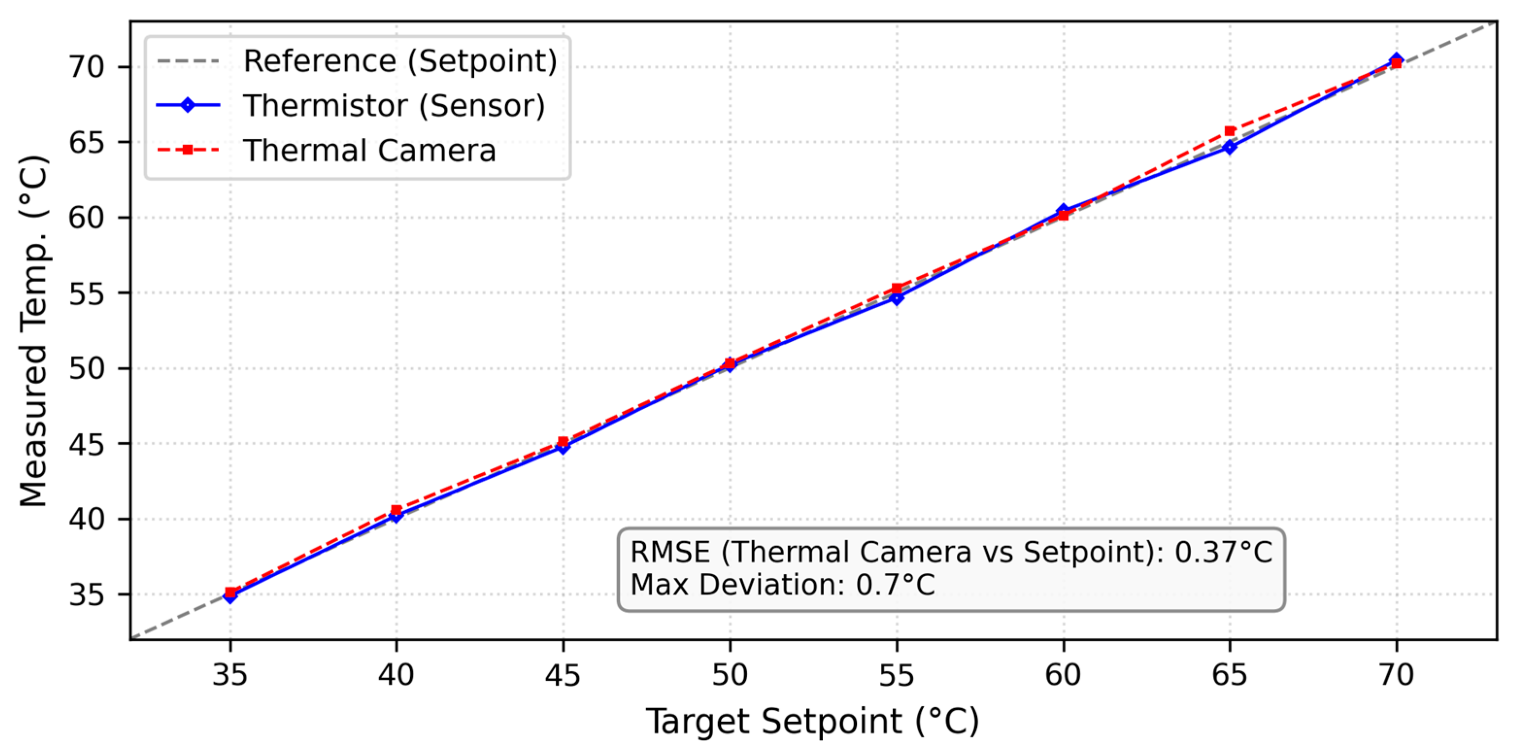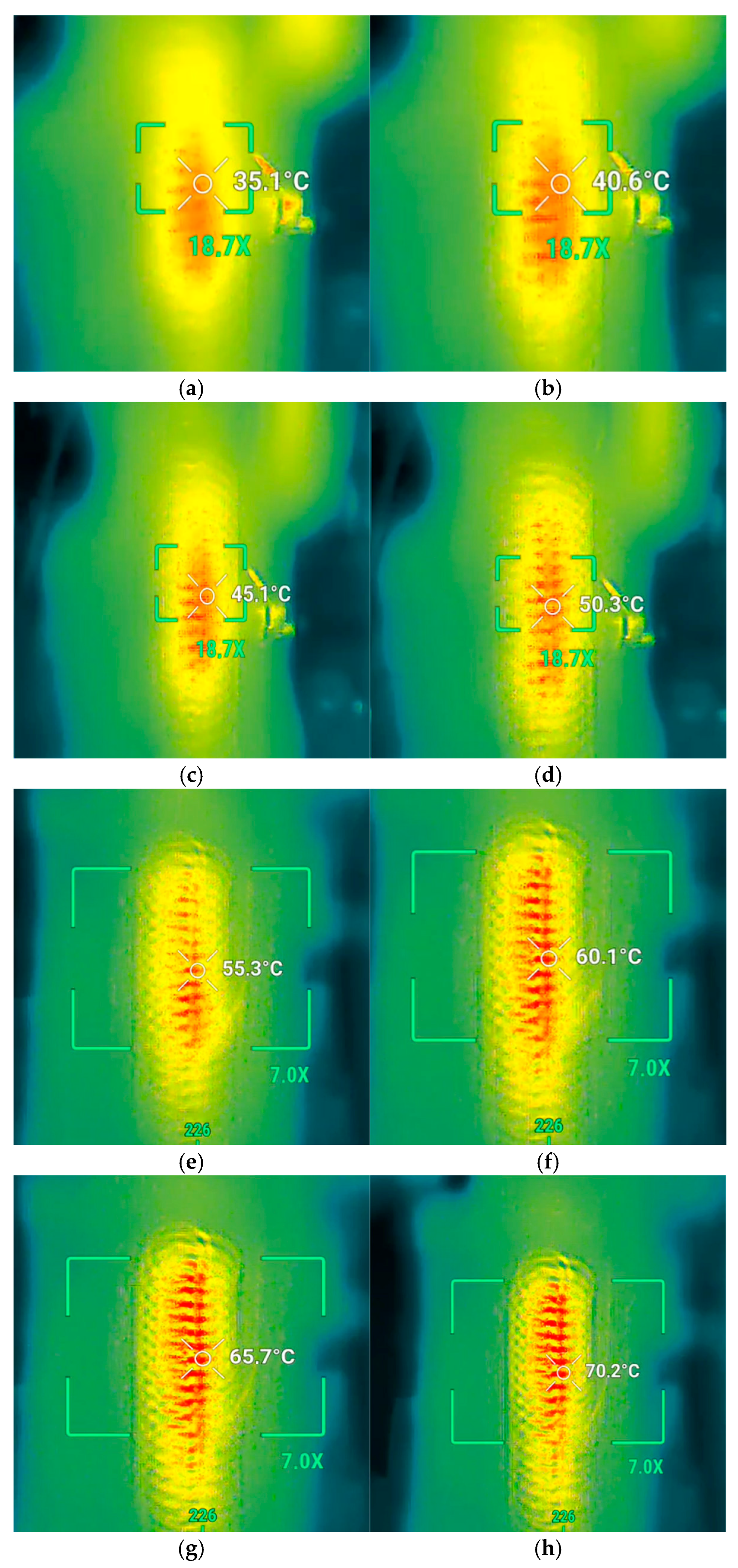 - Second, the proposed controller achieves high-precision temperature regulation across a wide operating range (35–70 °C). In the low-temperature regime (<50 °C), a mean steady-state error of approximately 0.26 °C was achieved. At higher operating temperatures (50–70 °C), the steady-state error increased slightly to approximately 0.41 °C due to enhanced heat dissipation, yet remained well within acceptable limits for SMA-based actuation. These results were further validated through non-contact thermal imaging, which showed close agreement between the global thermal field and local thermistor measurements.