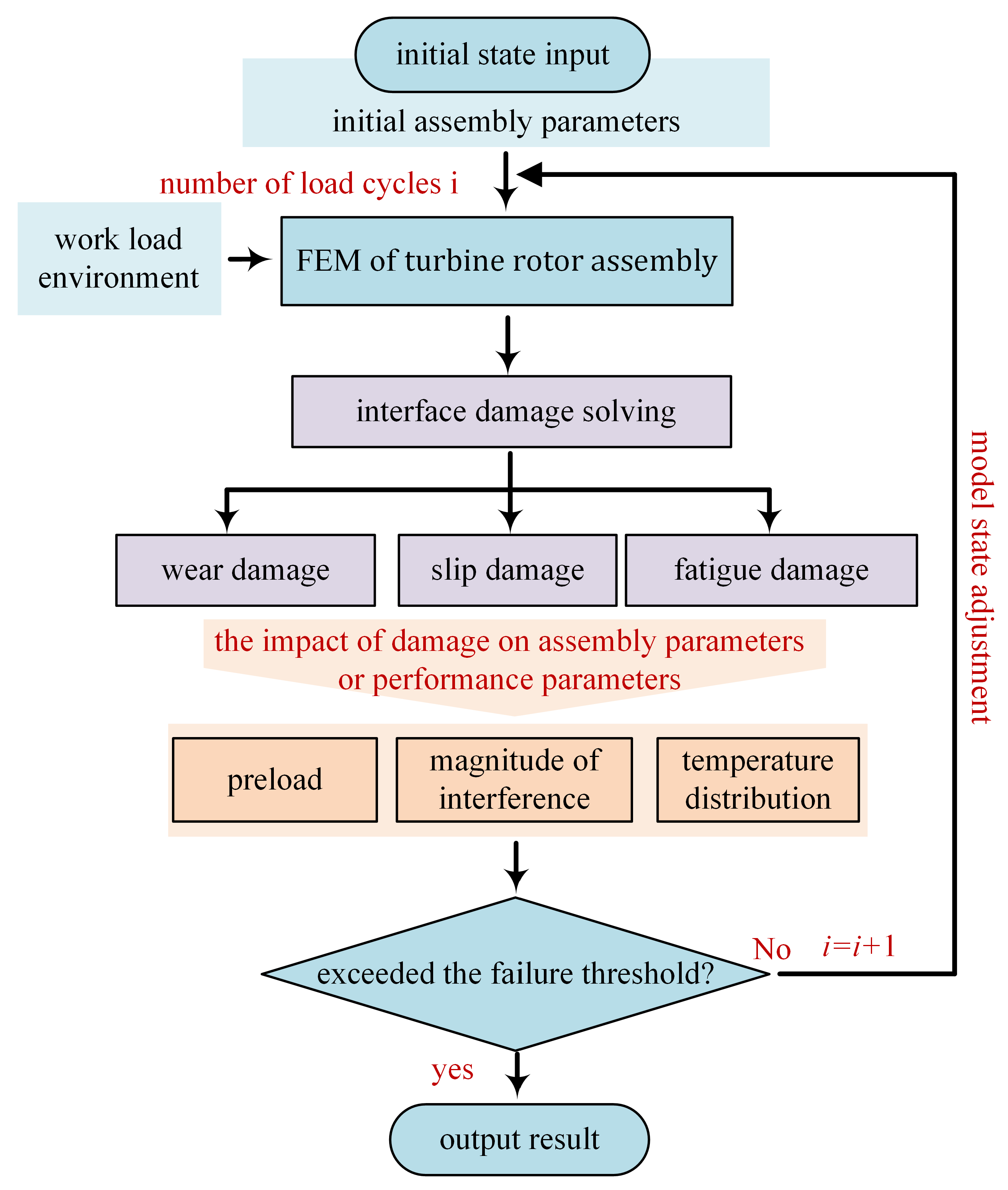 - Based on the quantitative analysis results from step 3, modify the equivalent preload and the equivalent interference magnitude of the cylindrical surface in FEM. The temperature distribution of the assembly is then updated based on the impact on cooling performance. Steps 2–4 are repeated until any one of the failure modes reaches its failure threshold, at which point that mode is identified as the final failure mode of the assembly.