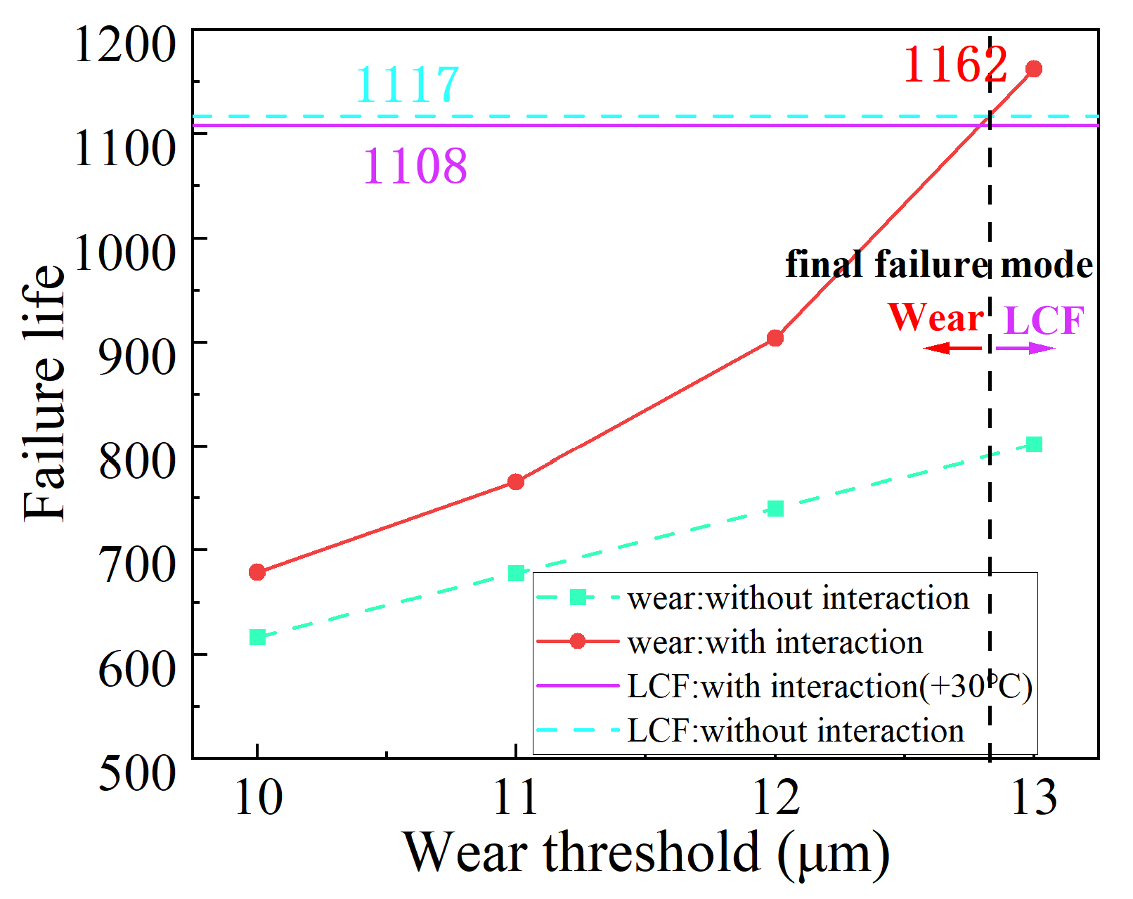 - Under the influence of continuous-type interaction and trigger-type interaction, the wear failure probability at end face 4 decreases compared to analyses neglecting such interactions. With a wear depth threshold of 11 μm at 800 cycles, the failure probabilities are 100% (without interactions) and 11.35% (with interactions). When the wear threshold is increased to 11.3 μm at 800 cycles, the failure probability remains 100% without interactions but drops to 2.75% when interactions are considered. Conversely, LCF failure probability of the turbine disk-blade attachment shows significant increases: at 800 and 1000 cycles, failure probabilities rise from 13.88% and 41.19% (without interactions) to 15.90% and 49.03% (with interactions, assuming a 50 °C temperature increase). These results demonstrate that multi-failure mode interaction exerts substantial impacts on assembly’s reliability, necessitating prioritized consideration in both reliability analysis and engineering design.