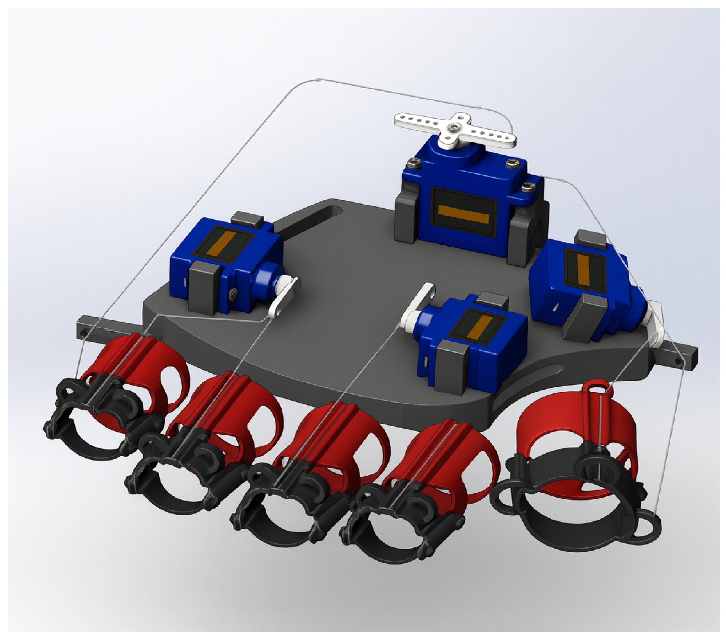 The tendon transmission system also underwent refinement. Initial prototypes utilized fishing line for tension transfer, which exhibited elongation and frictional wear over time. Replacing it with Kevlar thread resolved these issues, yielding consistent tension transmission and improved long-term durability. The final prototype incorporated optimized tendon routing and a compact servo assembly, enhancing both performance and reliability,