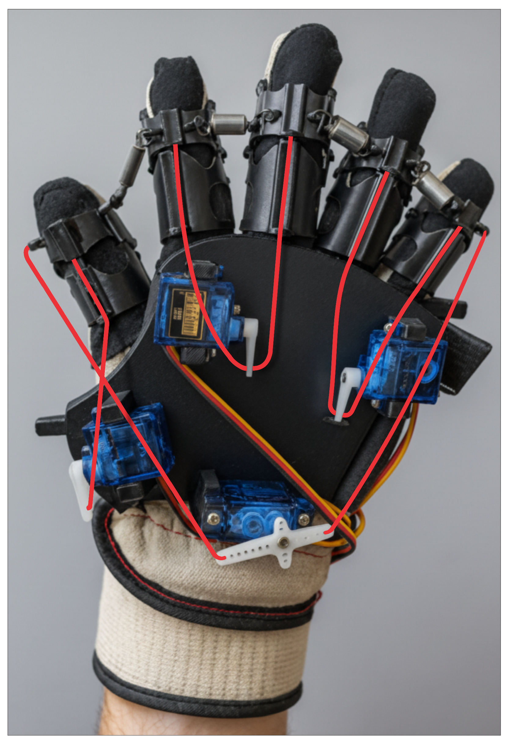 The actuation subsystem evolved through three principal configurations. The initial version employed individual linear actuators per finger, offering motion control but at the cost of excessive weight and power consumption. A second iteration replaced the linear actuators with servo motors, one per finger, reducing complexity but maintaining a bulky profile. The final configuration consolidated actuation into three servo motors to drive all five fingers: the index and middle fingers were coupled, as were the ring and pinkie fingers, while the thumb operated independently. A fourth motor enabled abduction/adduction via a torsion-based tensioning system. This arrangement improved mechanical efficiency, reduced power draw, and provided balanced weight distribution for prolonged use.