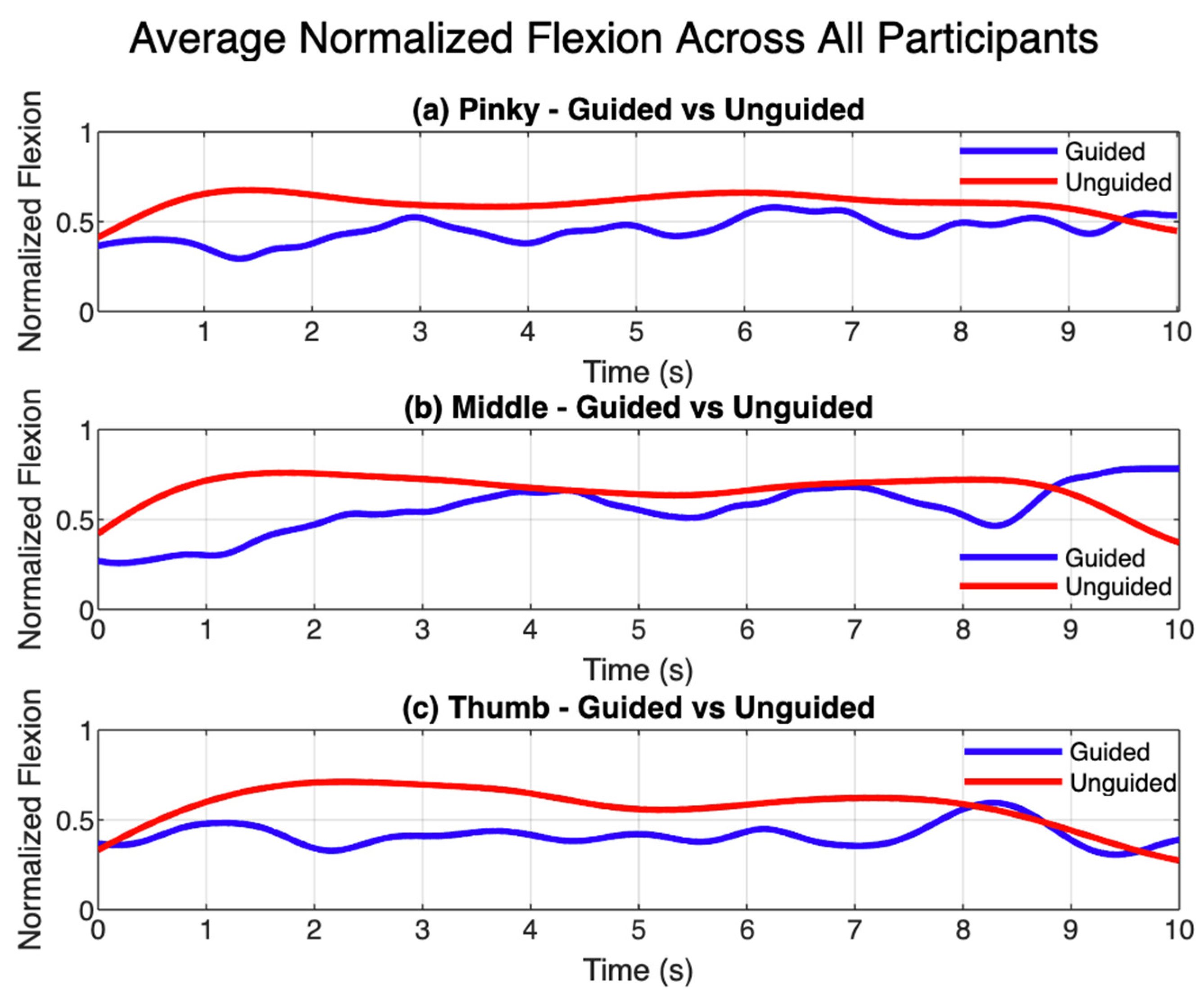 This normalization converted all measurements to a 0–1 range, allowing direct comparison across participants with varying hand sizes, strengths, and motion amplitudes. Each trial was then resampled to a uniform length of 1000 data points to standardize the time base and enable averaging across participants. Mean normalized trajectories were computed separately for guided and unguided conditions, generating representative profiles of joint motion and finger-specific force contribution. The x-axis in the resulting plots represents a normalized time scale (0–10 s equivalent) rather than absolute task duration, ensuring visual consistency across all participants. This unified processing approach ensured that both motion and force data were analysed under identical conditions, improving comparability and reducing variability between trials.