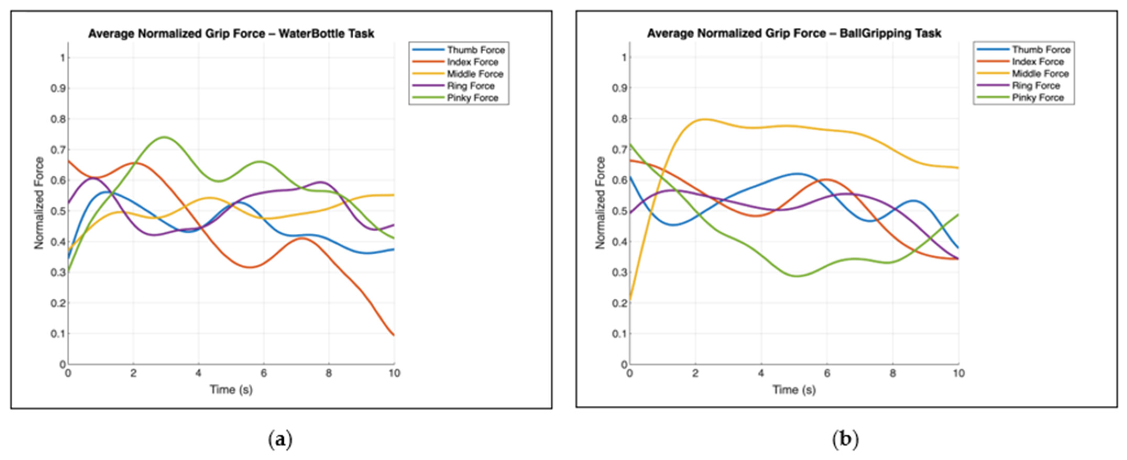 Figure 6a), the pinkie finger exhibited the highest force contribution. The mechanics of cylindrical gripping can explain this outcome: the pinkie and ring fingers provide stability and generate counterforce at the ulnar side of the hand, which is critical for securing objects of this shape. In contrast, when gripping a spherical surface such as a ball (