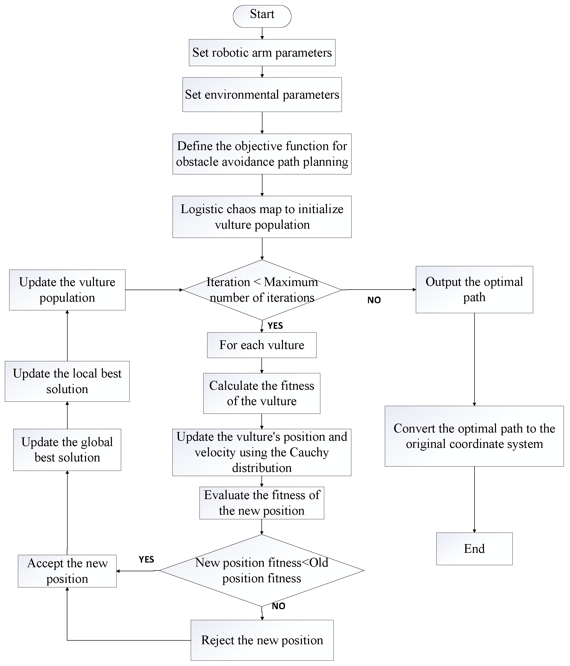 In addressing the challenge of obstacle avoidance and optimal path planning for robotic arms, this paper proposes a novel Cauchy Chaos-based African Vulture Optimization Algorithm (CC-AVOA). By introducing Cauchy mutation and logistic chaos mapping, the algorithm enhances population diversity and strengthens the ability to escape local optima, resulting in faster convergence. To verify the effectiveness of the proposed CC-AVOA, simulations were conducted in two-dimensional, three-dimensional, and robotic arm environments using MATLAB. The performance of CC-AVOA was compared against other algorithms. The simulation results show that CC-AVOA generates obstacle avoidance paths with fewer nodes and shorter lengths than other methods, demonstrating its practicality and effectiveness for robotic arm obstacle avoidance path planning.