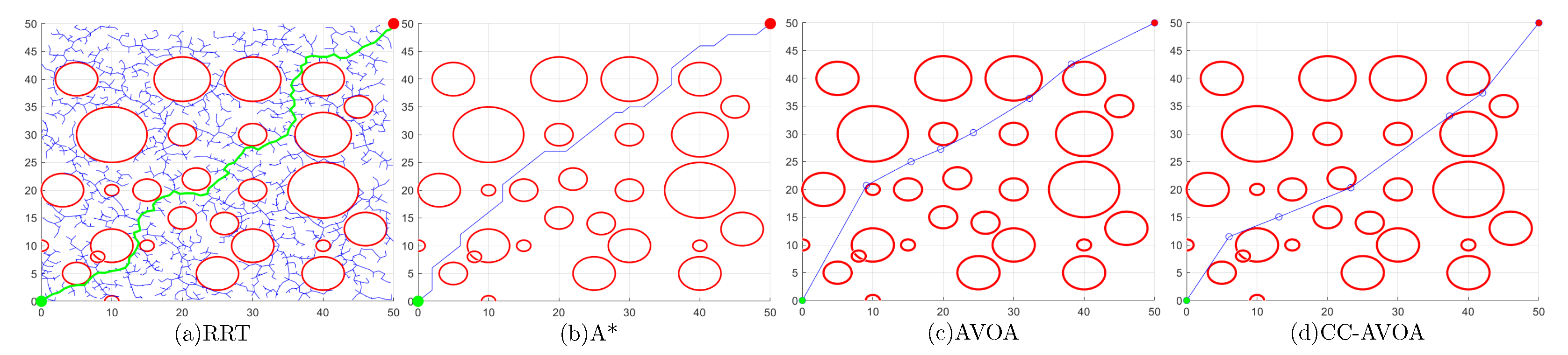 In the proposed CC-AVOA algorithm, each individual represents a candidate path from the start point to the target point, encoded as a sequence of control points , where and denote the fixed start and goal points, respectively, and are the intermediate control points to be optimized. These intermediate control points constitute the decision variables of the optimization process.