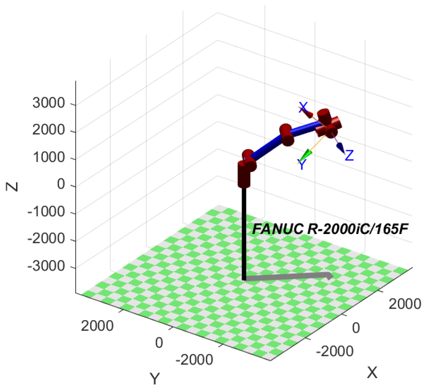are the viscous friction and Coulomb friction coefficients, respectively. The mass, center of mass, and inertia parameters of each link are set with reference to the technical manual of FANUC R-2000iC/165F.