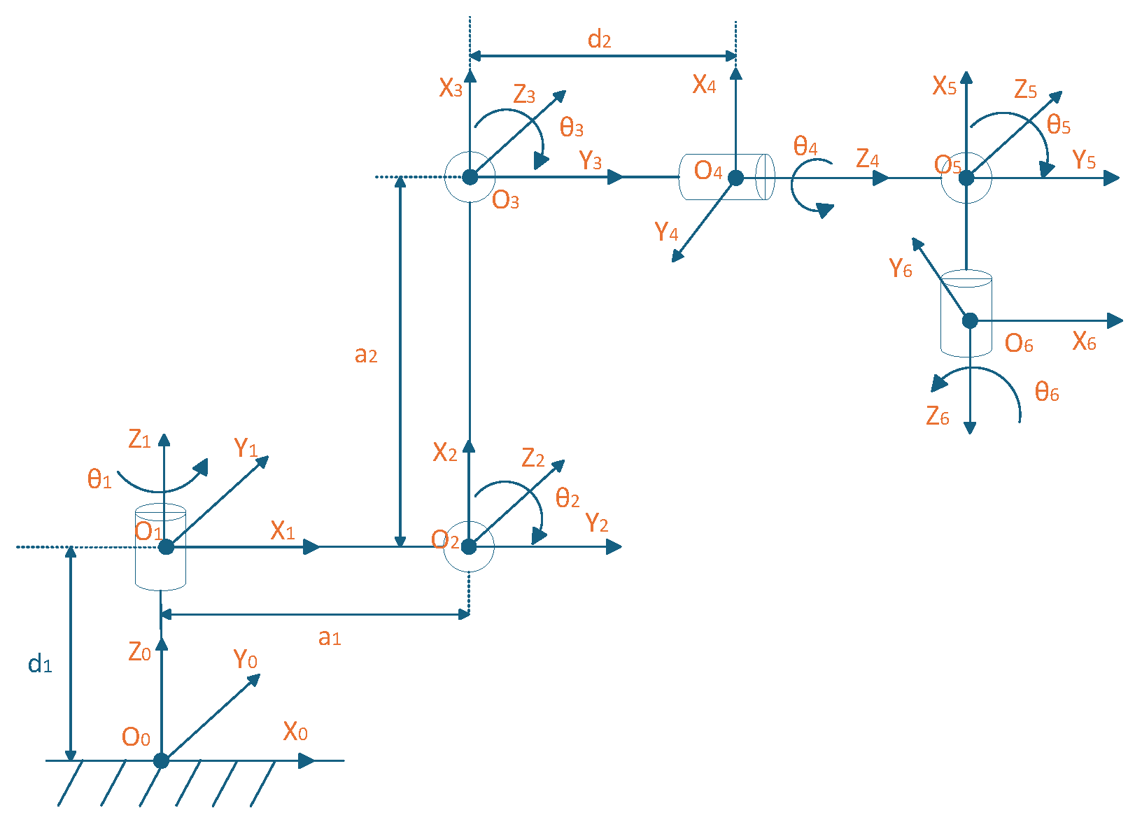 The required joint torques along a given trajectory are computed using the Recursive Newton–Euler Algorithm (RNEA). This dynamic model accounts for link masses, inertia tensors, center-of-mass locations, and the payload at the end effector, which is assumed to be either the rated payload or zero payload for baseline evaluation. For the FANUC R-2000iC/165F industrial manipulator, the Denavit–Hartenberg (D–H) parameters are listed in