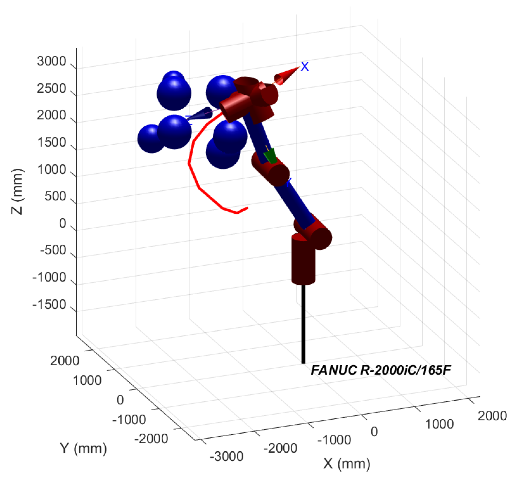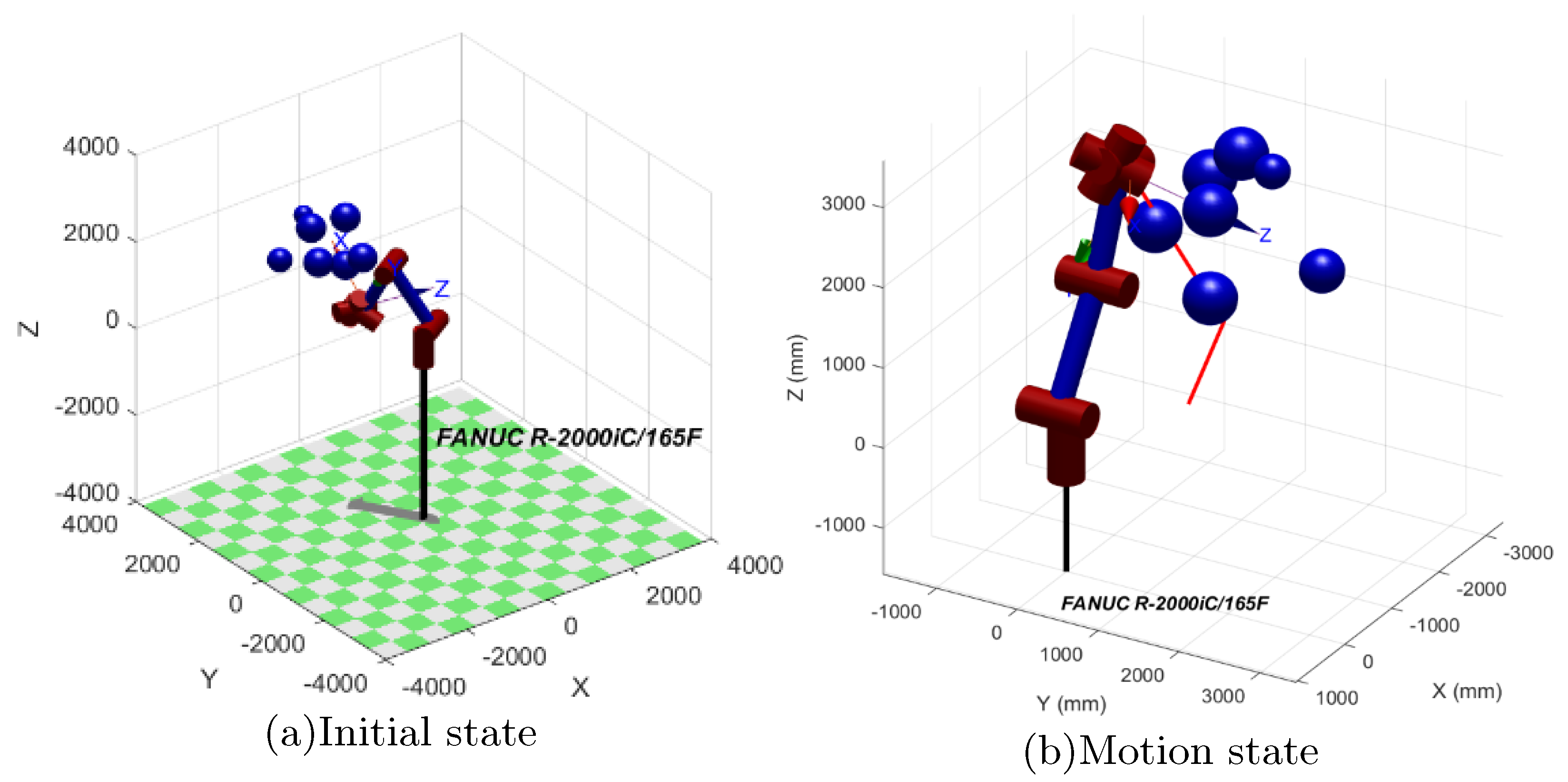 Given a Cartesian path point sequence generated by CC-AVOA, , where each point consists of the end-effector position and orientation, the inverse kinematics (IK) solver of the FANUC R-2000iC/165F manipulator is used to compute the corresponding joint configuration .