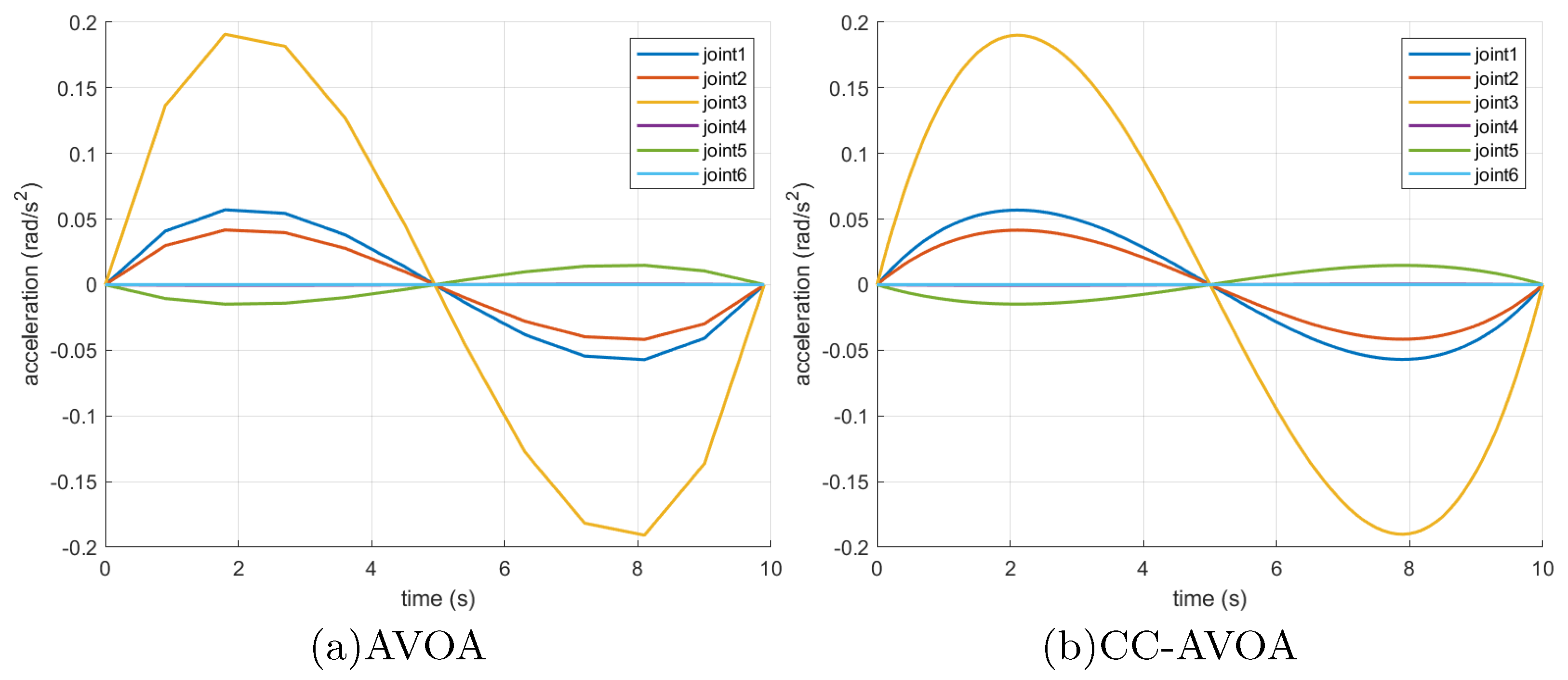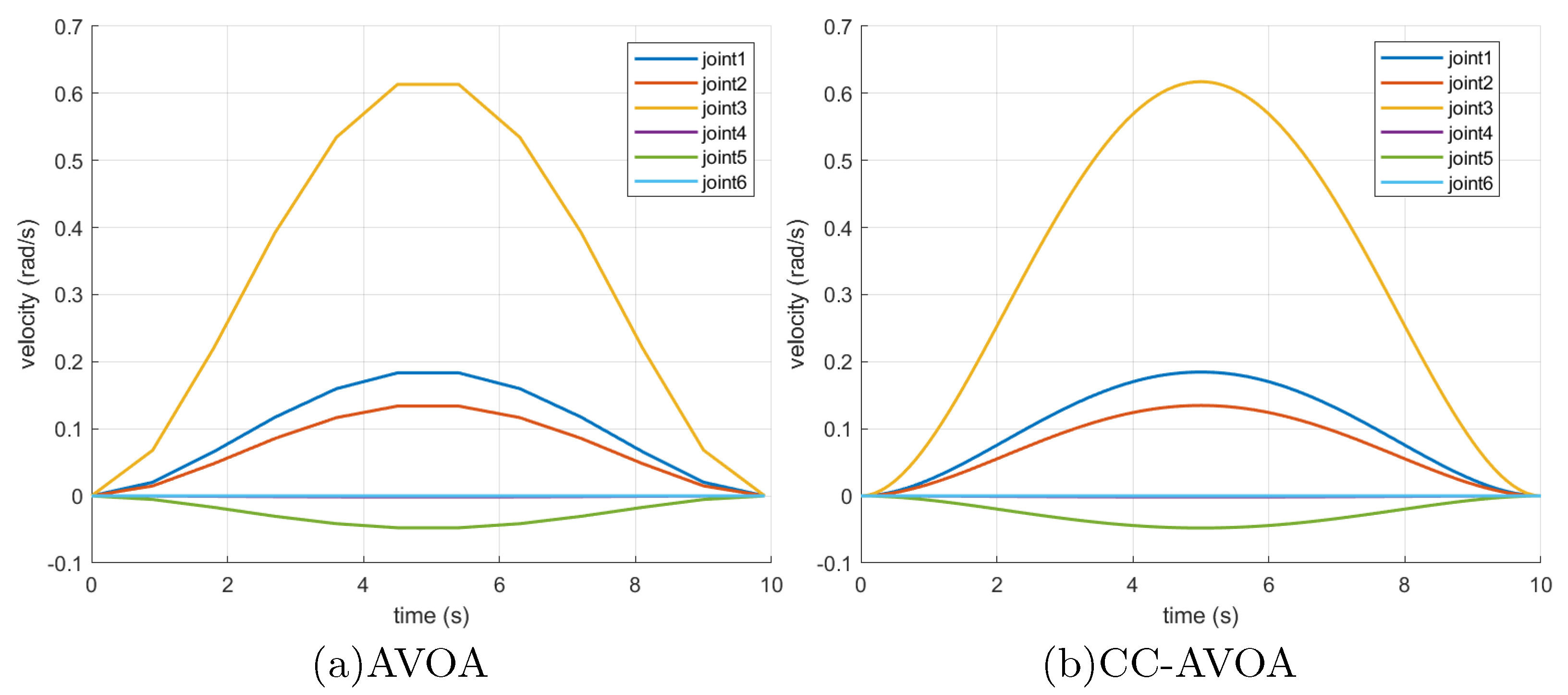 is a weighting factor. Collision avoidance constraints are evaluated via forward kinematics, and joint limits and singularity proximity are explicitly enforced. This optimization layer acts as a polishing step that refines the rough joint-space path generated by CC-AVOA without altering its collision-free topology. Through quintic polynomial time parameterization and joint-space optimization, the generated trajectories are continuous in position, velocity, and acceleration, with bounded jerk, fully satisfying the execution requirements of industrial servo systems.