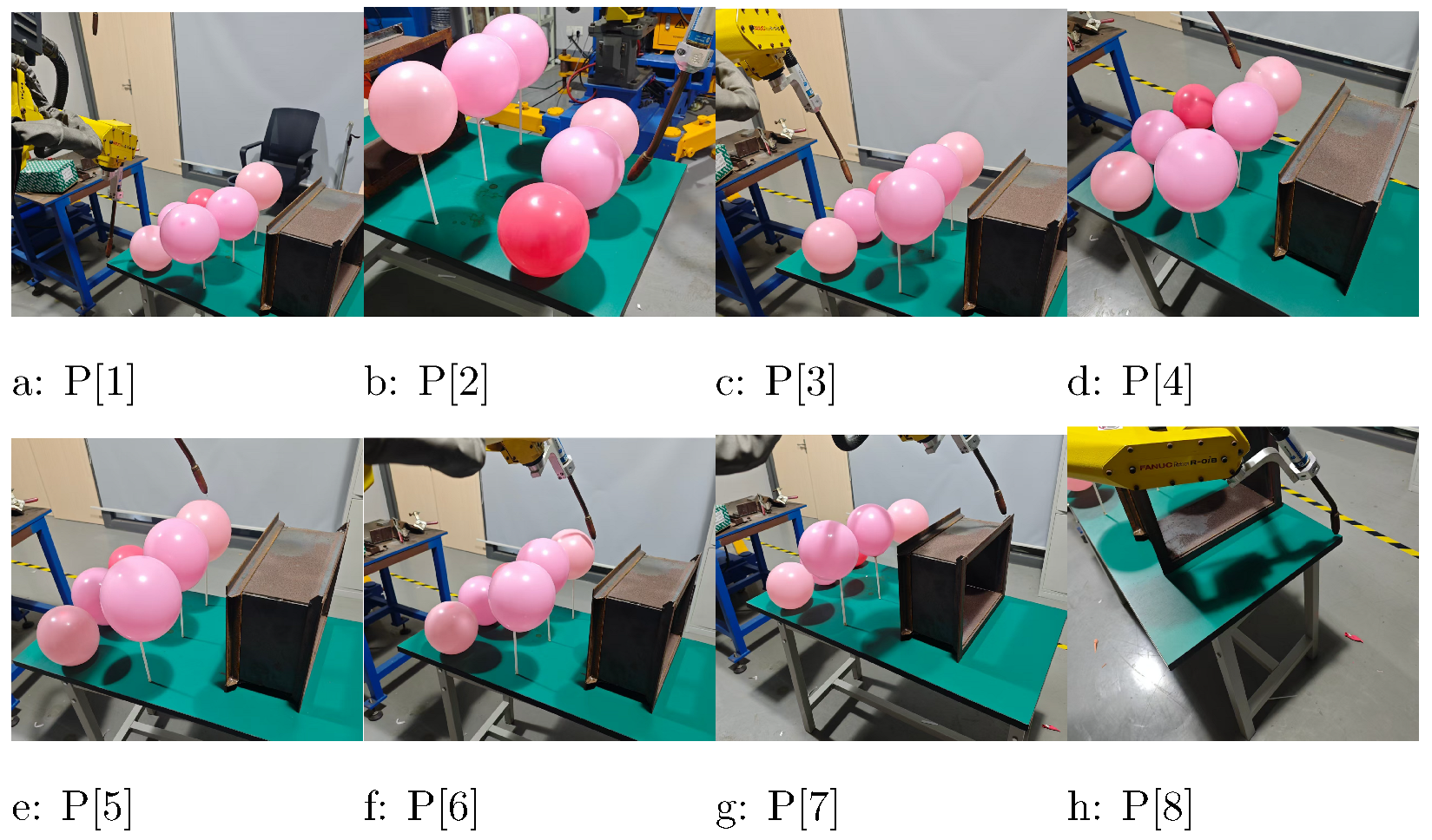 To validate the proposed method under industrial-relevant conditions, the built-in manipulator model in RoboGuide is adopted, with link parameters and joint limits consistent with the physical equipment. Within the manipulator’s workspace, six spherical obstacles (each with a radius of 6 cm) and one cuboid obstacle (dimensions: 43.8 cm × 11.6 cm × 32.1 cm) are deployed. The size and position of the obstacles are identical to those in the laboratory to ensure experimental comparability. Subsequently, the path points generated by the CC-AVOA algorithm are imported into RoboGuide. The Cartesian path points generated by the CC-AVOA algorithm are transformed into joint-space trajectories using the inverse kinematics solver provided by the RoboGuide platform. When multiple inverse kinematics solutions are available, the configuration closest to the previous joint state is selected to ensure motion continuity and avoid sudden joint changes. During trajectory execution, joint limits defined by the FANUC controller are strictly enforced. In addition, configurations close to kinematic singularities are avoided by maintaining sufficient clearance in the workspace, ensuring stable and safe robot motion throughout the execution process. The manipulator trajectory is executed, and the actual path is recorded as illustrated in