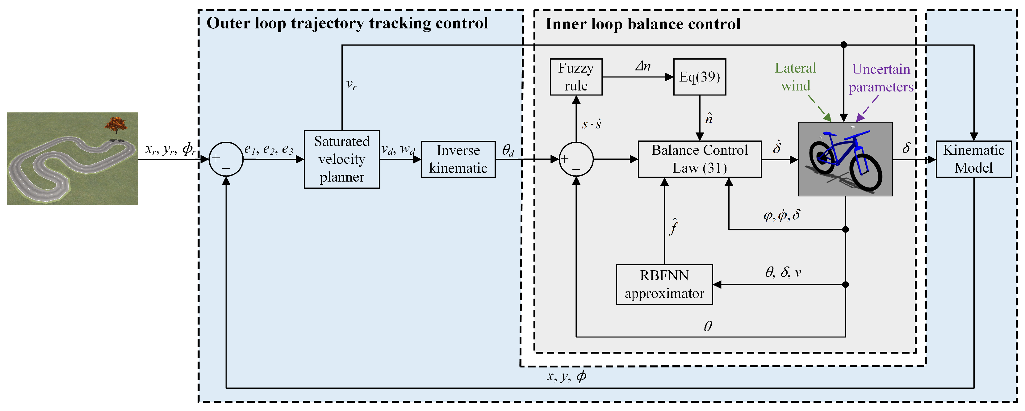 Specifically, the outer control loop includes the saturated velocity planner based on the hyperbolic tangent function, which eliminates tracking errors and enhances stability under the saturation constraints of longitudinal velocity and yaw rate. Through inverse kinematic, the desired speeds can be transformed to roll angle and taken into the inner balance control loop, which integrates the RBFNN approximator and FSMC. By designing an appropriate fuzzy rule, FSMC adapts the exponential rate reaching law coefficient to attenuate the chattering effect. The RBFNN approximator can identify and compensate for the disturbance term to further improve adaptability and robustness of the control system.