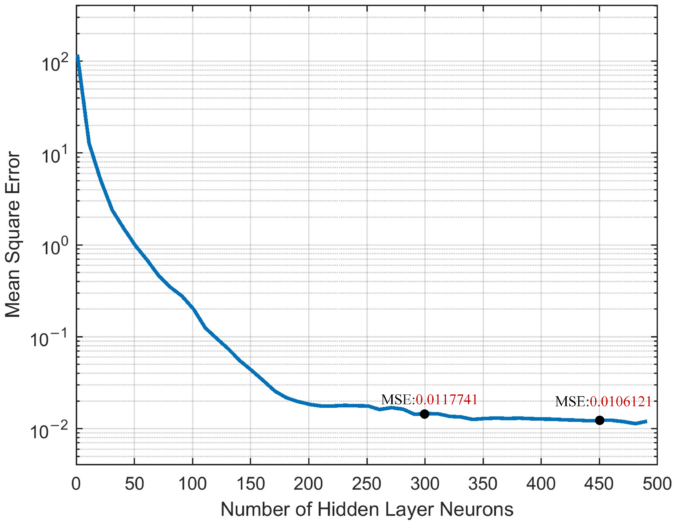 Figure 5 that the mean square error (MSE) is 0.0117741 when the number of hidden layer neurons is 300. But the MSE only decreases by 0.001162 when the number is 450. Hence, we set the number of hidden layer neurons as 300 to avoid increasing the complexity of the network and ensure a good approximation effect. The structure of the RBFNN is 2-300-1 with the parameter