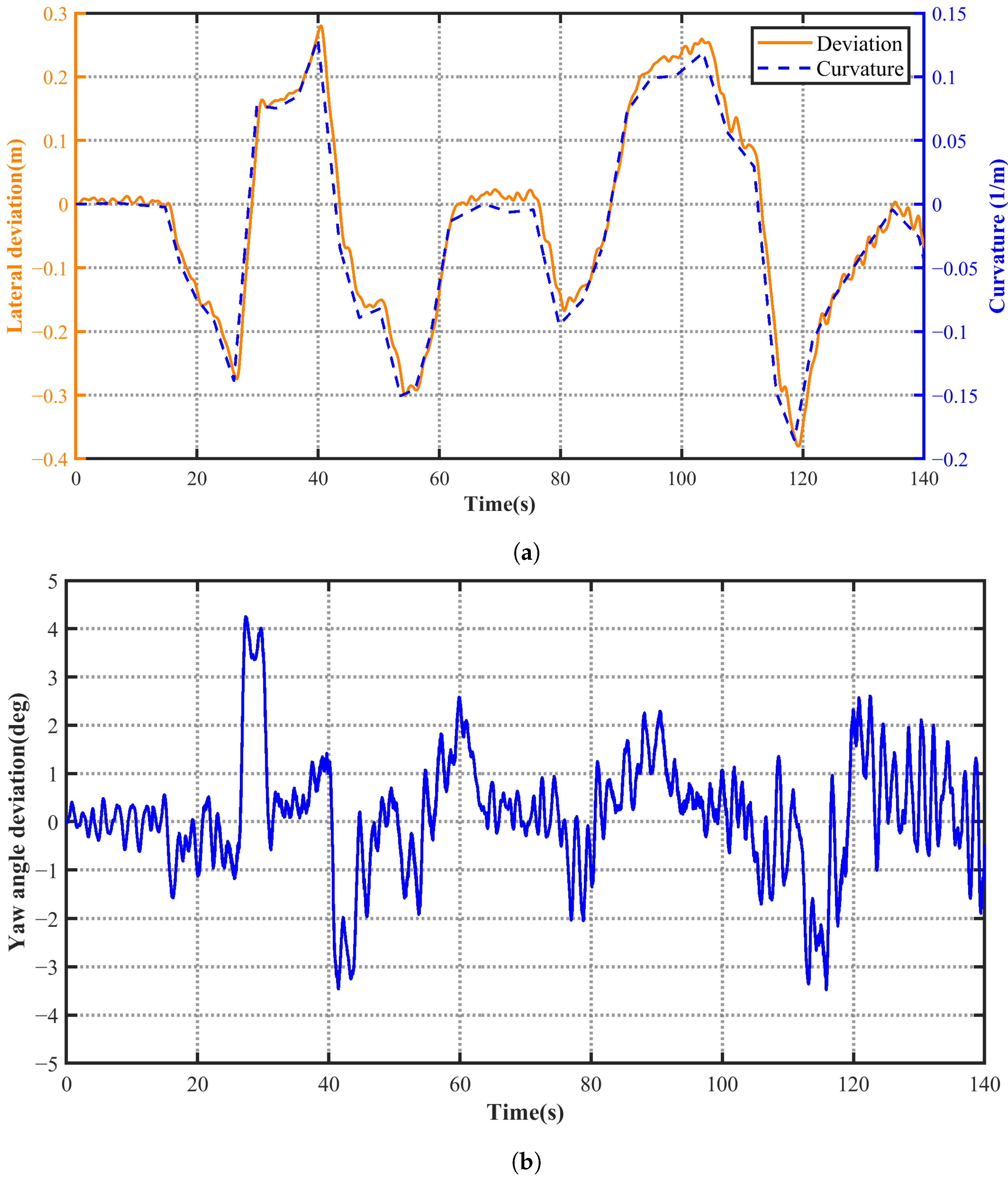 Figure 9 shows that the trend of lateral deviation is similar to the curvature and their peak times are the same. The reason for the lag phenomenon is that the desired roll angle, the input to the balance control loop, is not a control quantity directly generated by the actuator, which causes the steering angle to rotate in the opposite direction to generate corresponding inertial force and, then, obtain desired roll angle. The phenomenon is also called “left-turn first-right”. Although the lag cannot be avoided, the peak lateral deviation remains within 0.4 m and the peak yaw angle deviation does not exceed 4.5°. Therefore, the controller is effective in complex tracking scenario.
