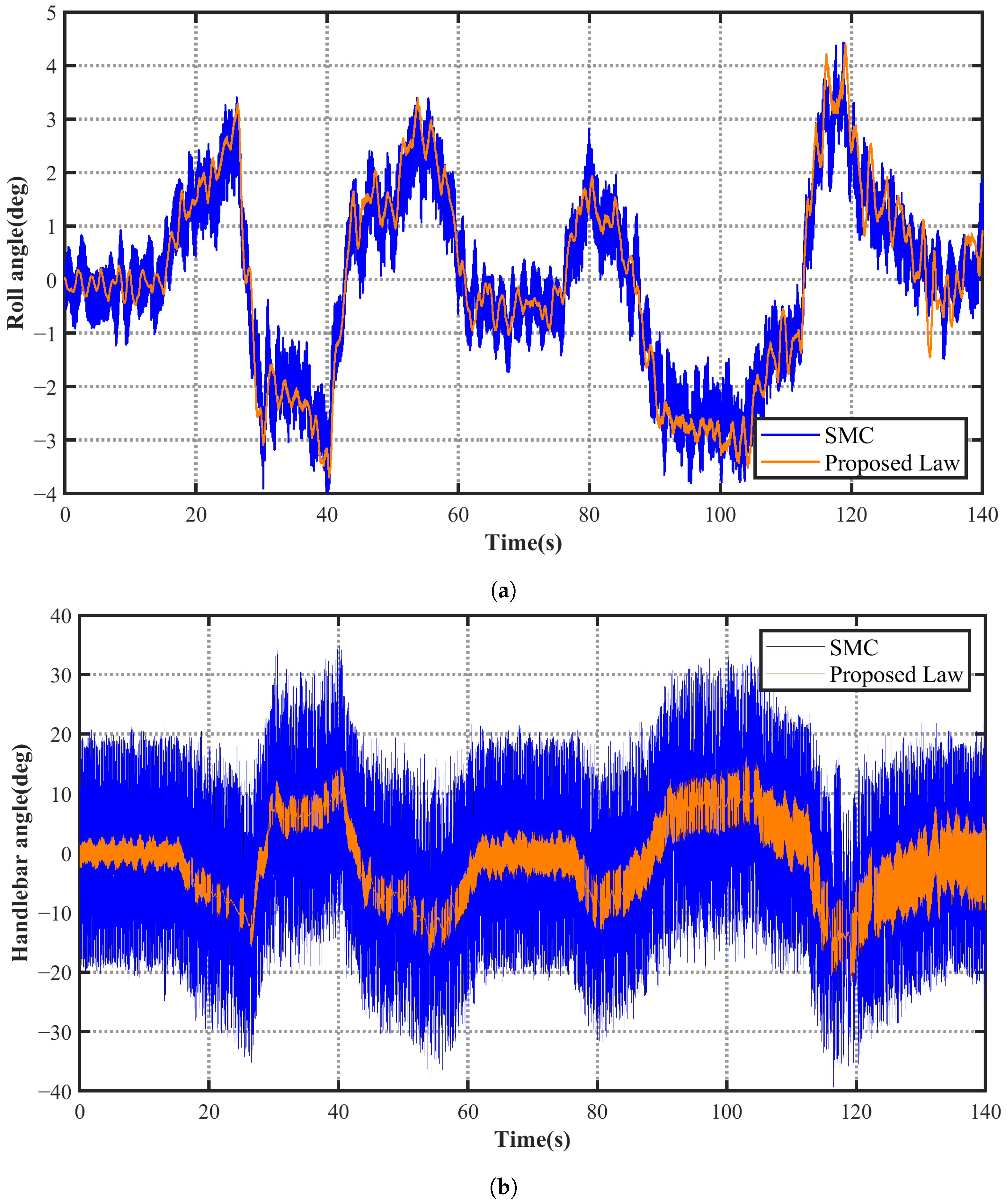 Figure 10, the trend of the steering angle and the roll angle is similar while their directions are opposite, indicating the coupling between these two variables. The simulation results of SMC and the proposed control law are compared under the same control parameters. It is known that both the chattering amplitude and frequency of the roll angle and handlebar angle are significantly reduced under the proposed law. Specifically, the chattering amplitude of the roll angle is constrained within 1°, the effect of which can be neglected. Meanwhile, the chattering amplitude of the handlebar angle is reduced by nearly 20°.