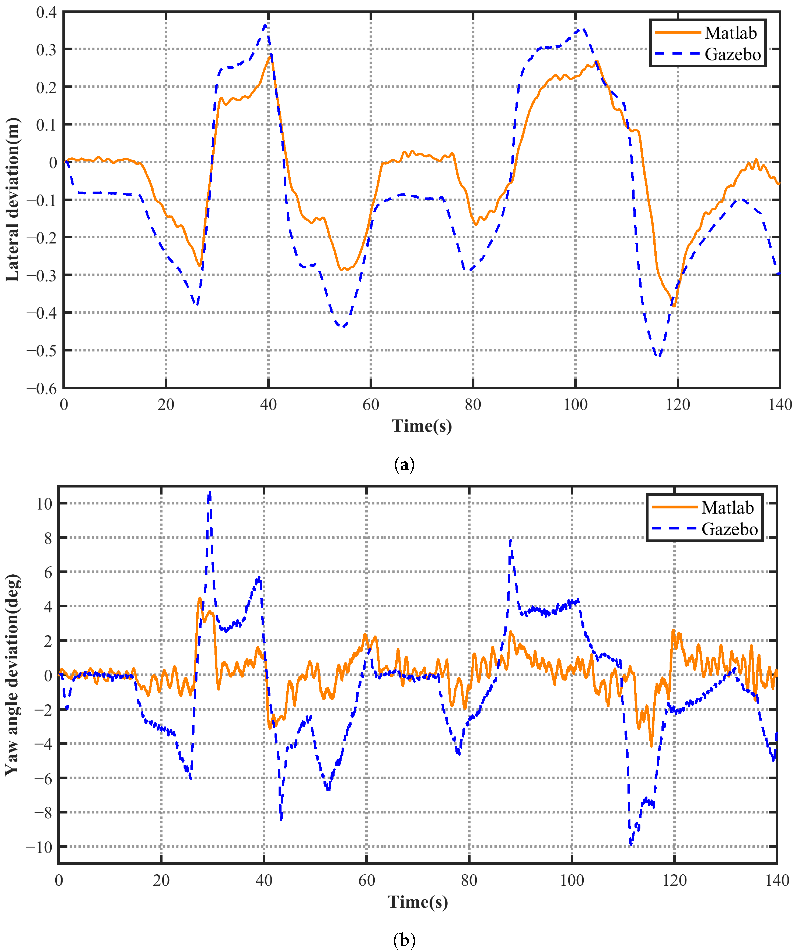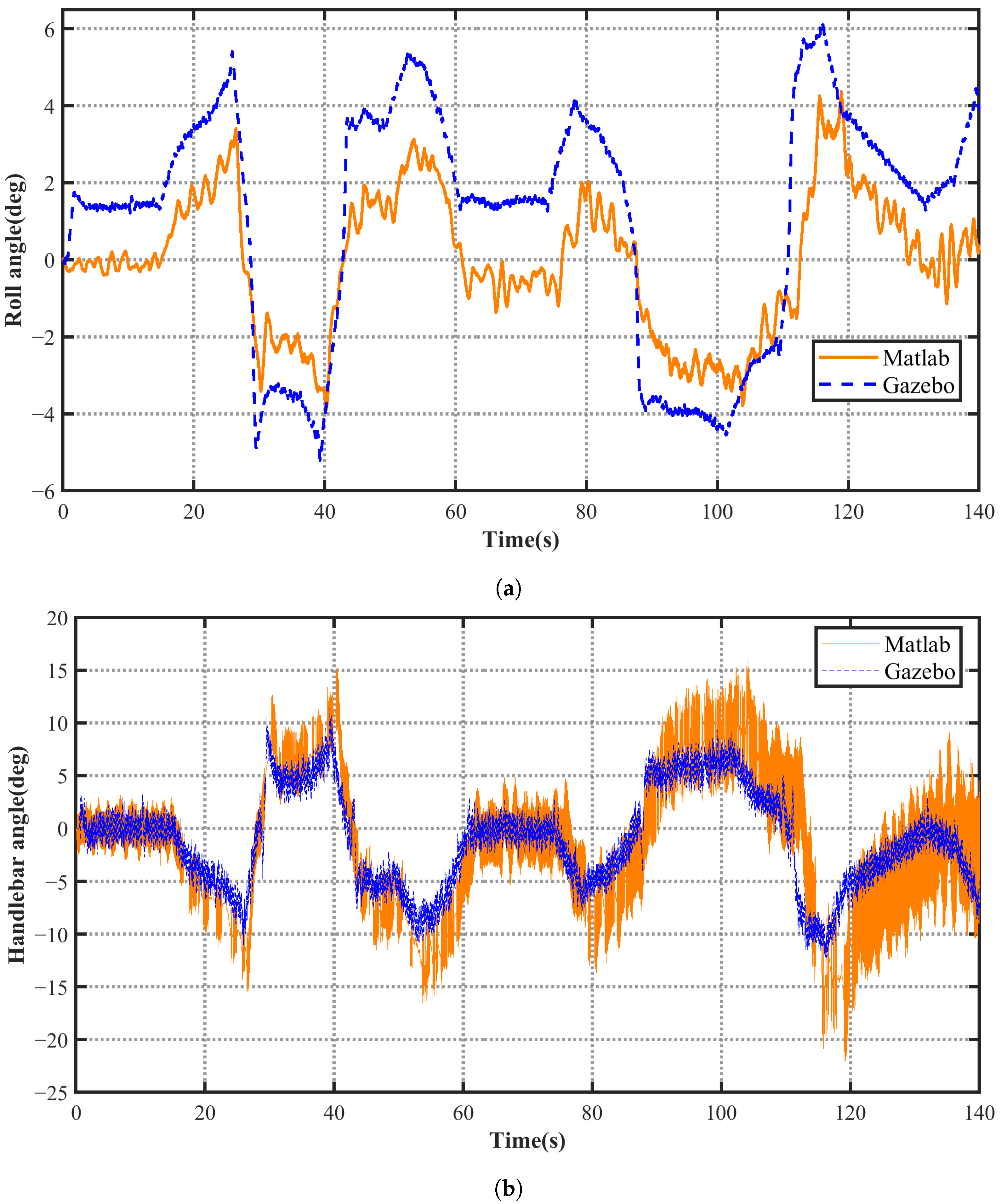 The chattering amplitude is associated with the control parameter n. In the SMC, the coefficient n of the term is fixed, which tends to cause large amplitude when the system state crosses the sliding surface. By contrast, the proposed law incorporates a fuzzy control to adaptively adjust this coefficient, thus effectively attenuating the chattering amplitude. What is more, the handlebar angle still rapidly varies due to the ignored steering dynamics. To address this, a low-pass filter is incorporated in the Gazebo simulation to smooth the angle output, which can approximately simulate the effect of steering dynamics.