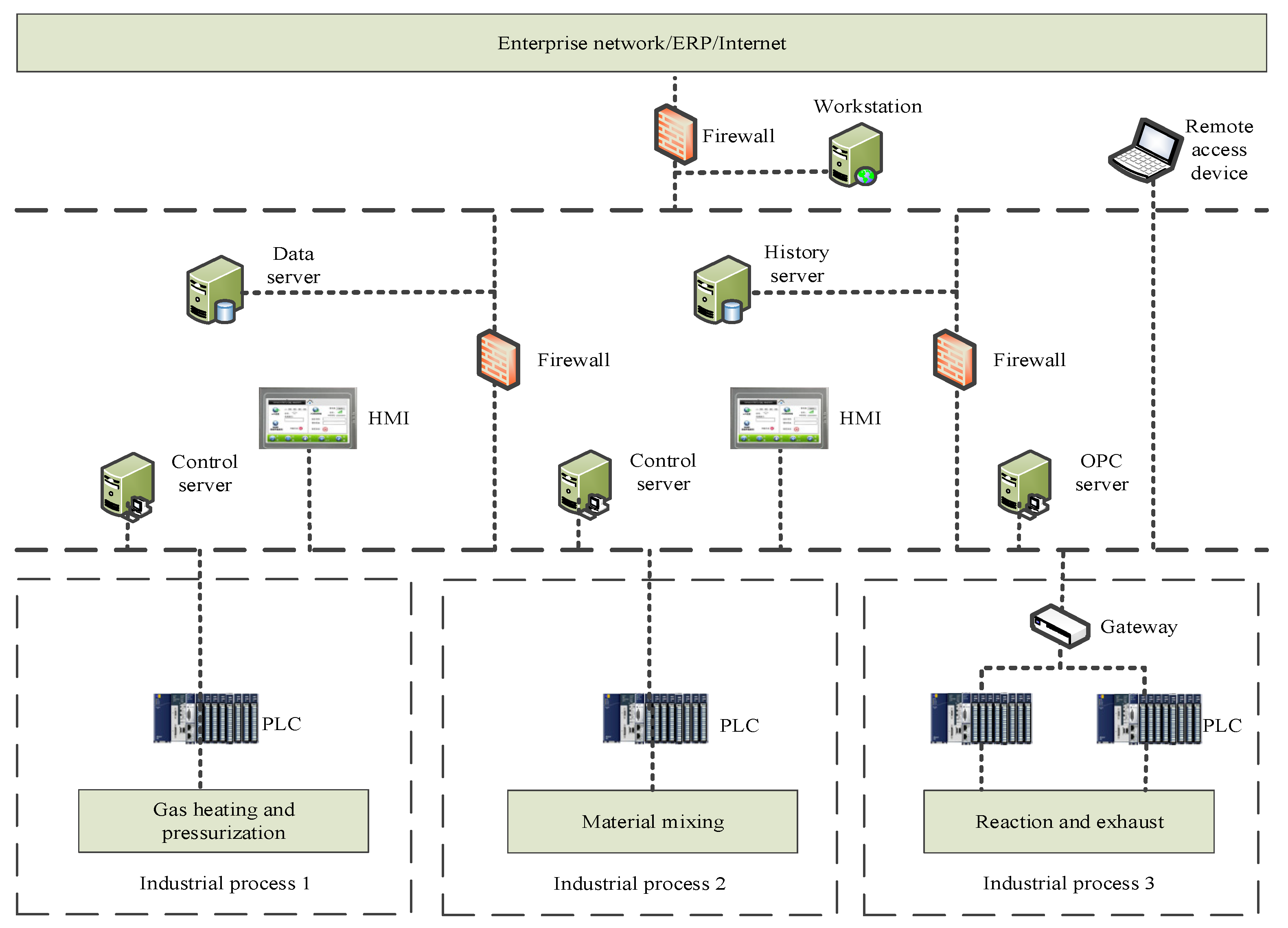 As mentioned earlier, Lx =1 indicates that the operation is directly related to the control business. Each process, such as gas heating and pressurization, mixing, reacting, and exhausting will have a set of control programs, and each set of control programs indicates a strict time sequence within the period, such as opening/closing/increasing/decreasing the valves, etc. TPM saves the integrity metrics of the control programs and verifies the integrity according to a certain frequency (f2). Once an anomaly occurs, it implies that there may be tampering of the data by the control servers and the PLCs; the TPM interrupts the operation process and submits it to the detection server to analyze the code logic relationships. Simultaneously, the access control module also monitors the execution process of each group of control programs with timing relationships within the process in real time. Once recognizing that critical control instructions violate the business timing, such as reading/writing programs segment that are not the current business segment, the module issues an early warning and interrupts the operation process.