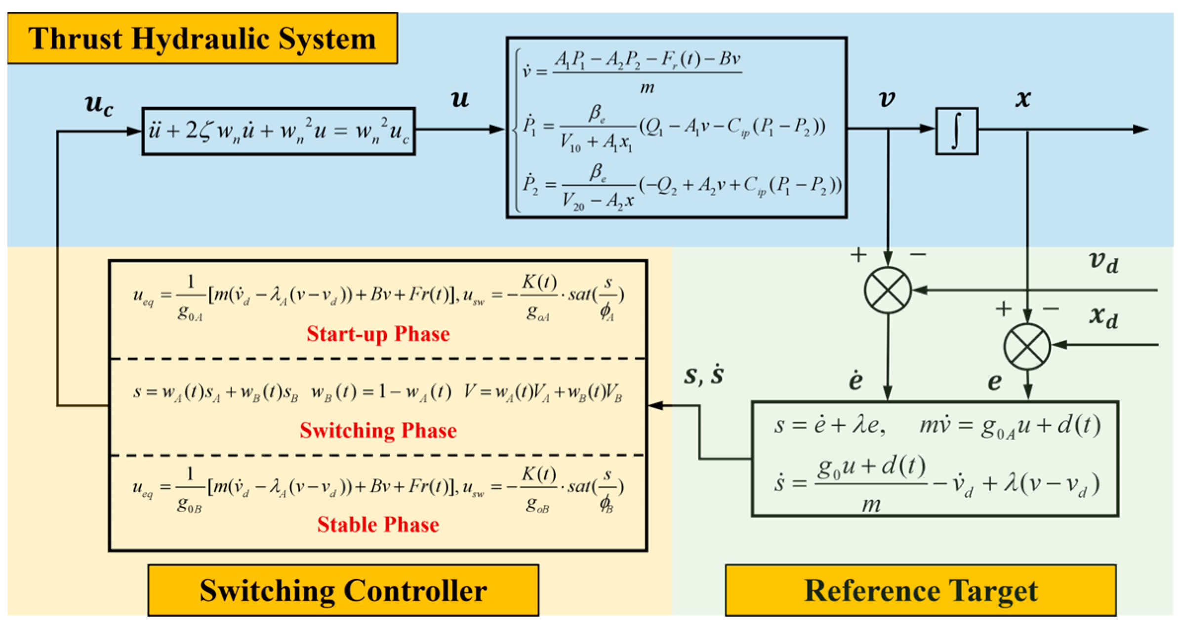 - We formulate a precise state-space model of the thrust hydraulic system, and experimentally obtain the cylinder’s external load conditions and system parameters.