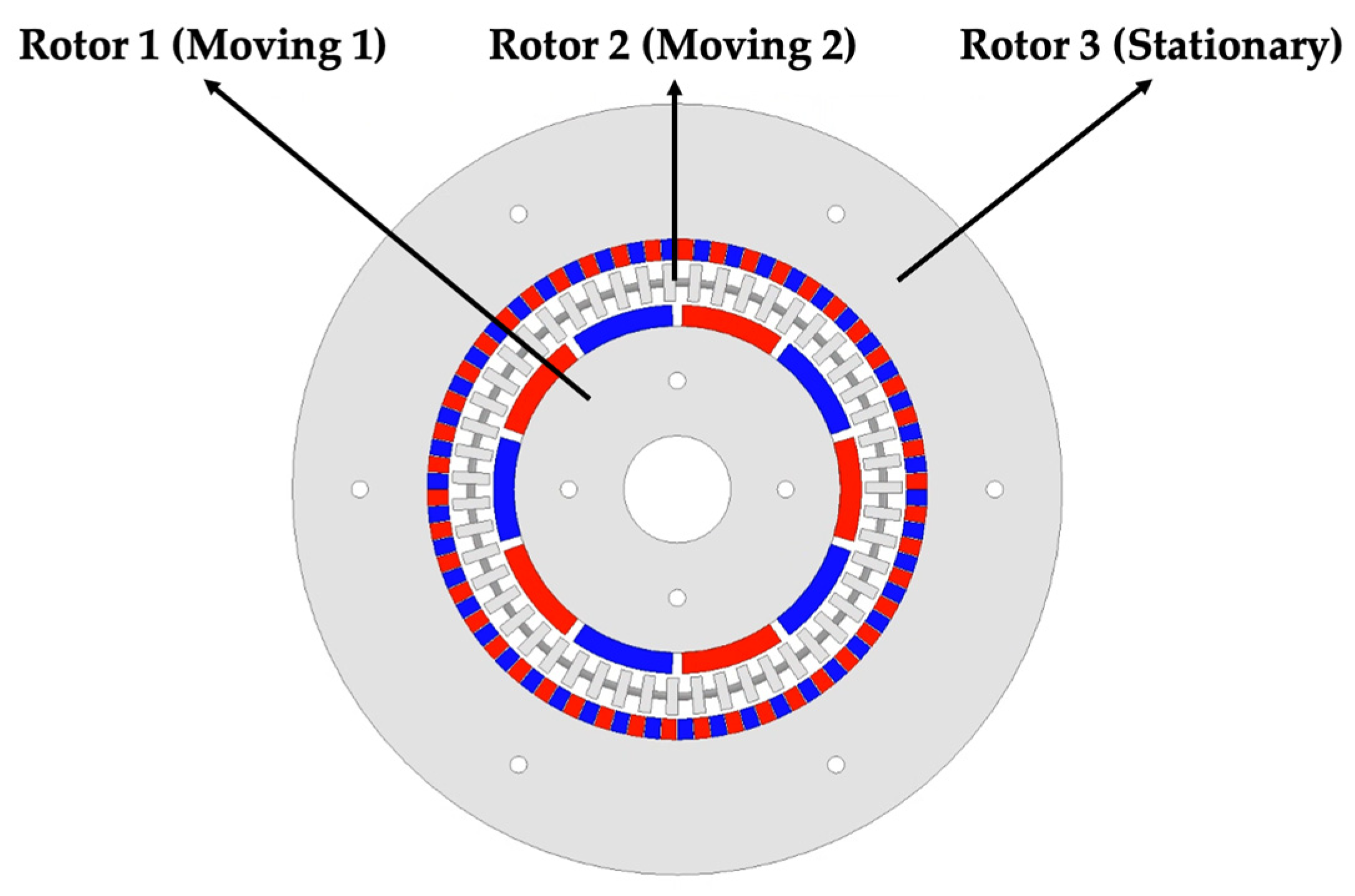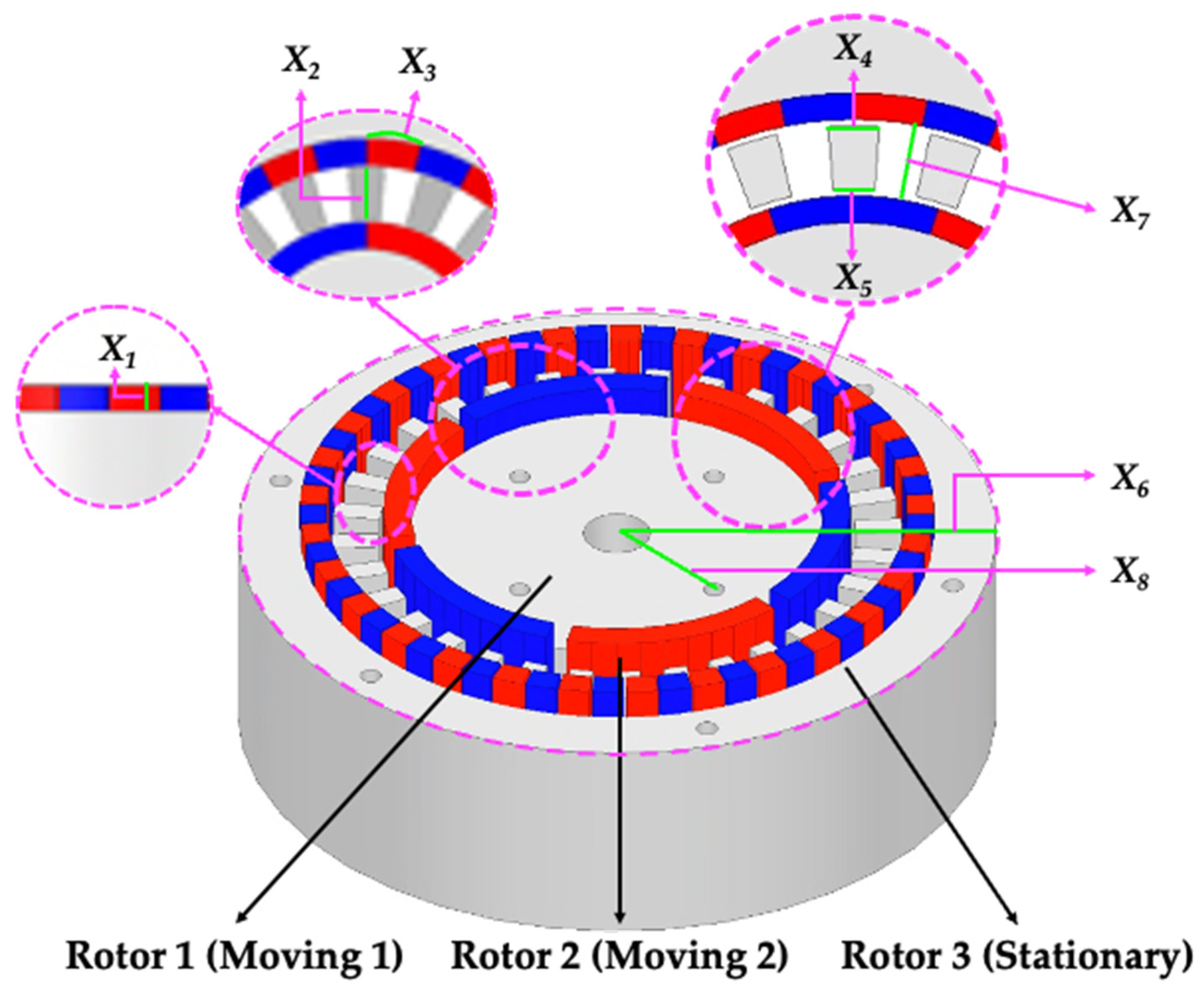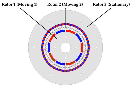 The geometry and corresponding rotor configuration of the initial CMG model are shown in Figure 1, while the detailed dimensions and model specifications of the design variables, adopted from a previously validated study, are summarized in Table 1. The CMG consists of three primary components: (1) Rotor 1, which receives the input torque; (2) Rotor 2, which delivers the amplified output torque; and (3) Rotor 3, a stationary ferromagnetic modulator that provides structural support and facilitates magnetic flux modulation. All baseline dimensions and electromagnetic specifications were adopted from the previously validated CMG model to maintain consistency and ensure fair comparative evaluation.