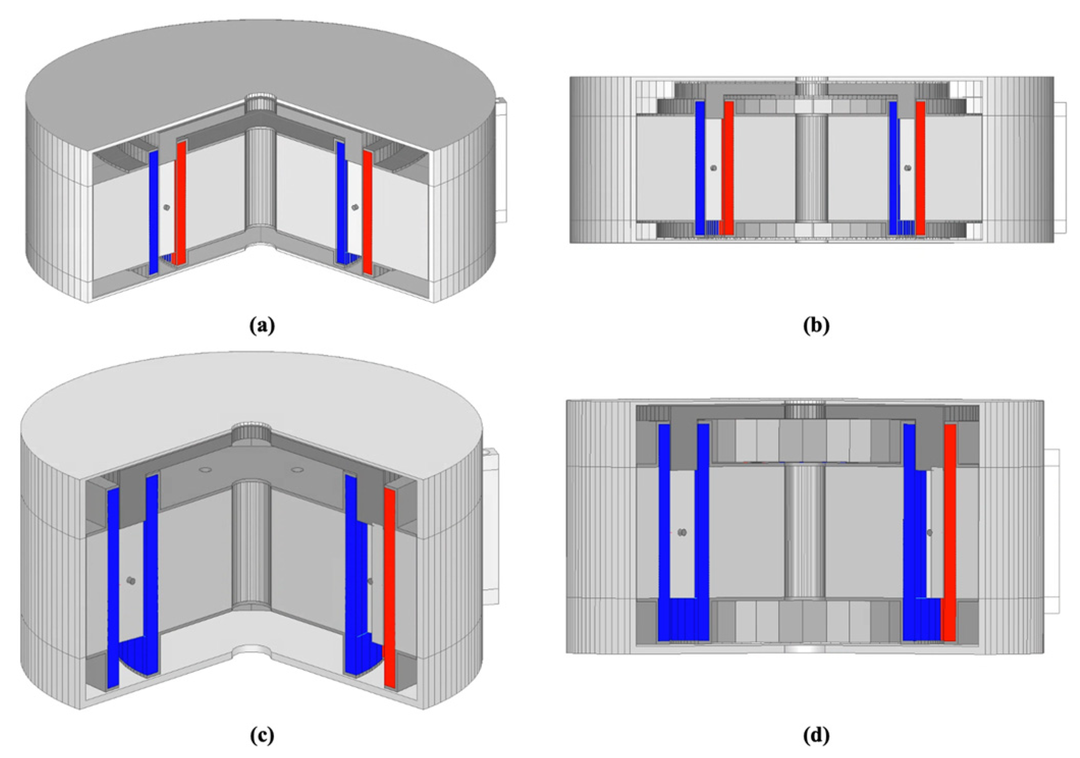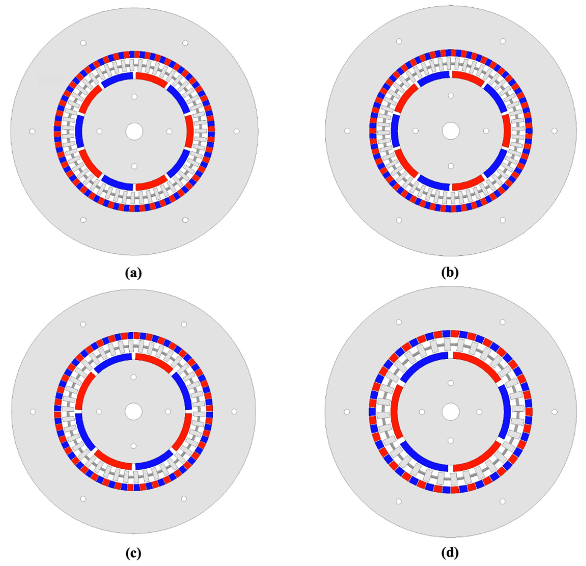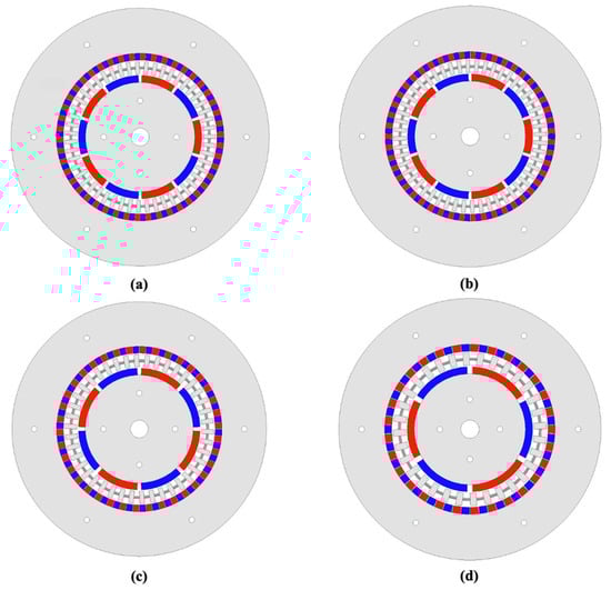 All four CMG models share identical geometric dimensions and baseline design parameters listed in Table 1, and differ only in their pole-pair combinations. The corresponding values of , and for each configuration are summarized in Table 2, and the geometric layouts of the four CMG models are illustrated in Figure 2.