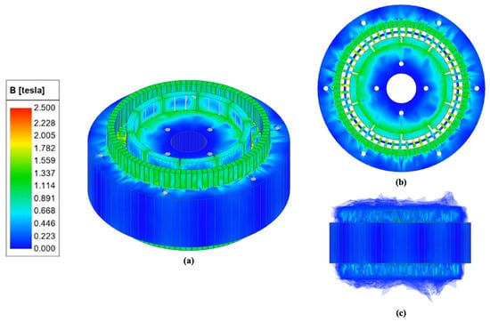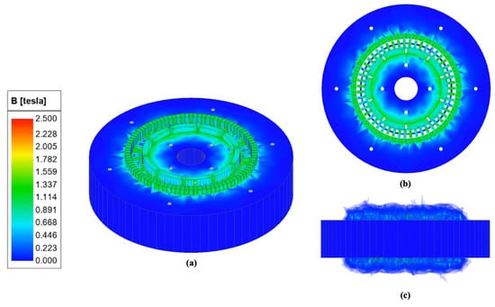 Accurate performance prediction of CMGs typically relies on the finite element method (FEM). Although two-dimensional (2D) FEM offers relatively low computational cost and fast evaluation, it cannot adequately capture axial leakage flux and overhang-induced three-dimensional (3D) effects, which leads to reduced accuracy in torque prediction for CMGs with complex geometries [29]. In contrast, three-dimensional FEM enables a more faithful representation of these phenomena and has therefore been widely adopted for high-accuracy electromagnetic evaluation of CMGs [30,31,32,33].