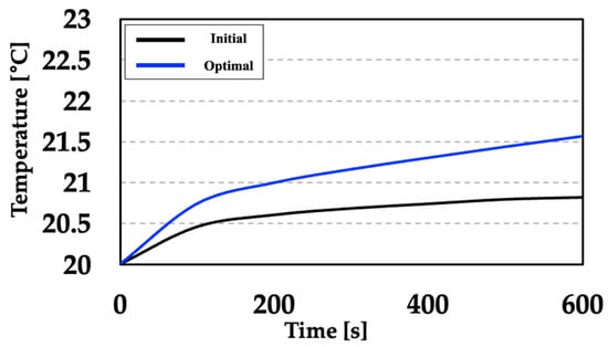 To further illustrate the transient thermal behavior of the CMG, the time evolution of the maximum temperature rise over the 10 min simulation interval is compared for the initial and optimized models. The corresponding temperature evolution curves are presented in Figure 14. Plotting both curves on the same axis highlights differences in thermal response and enables direct visual comparison of the transient thermal trends.