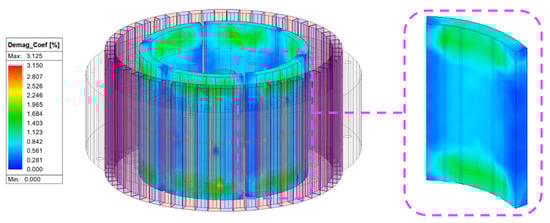 Based on the electromagnetic–thermal coupled analysis, no noticeable thermal issues were observed under nominal operating conditions. Nevertheless, to conservatively assess the long-term reliability and thermal robustness of the permanent magnets, an additional demagnetization analysis was conducted under a more severe condition in which the CMG was exposed to a fixed temperature of 150 °C. The resulting demagnetization characteristics are presented in Figure 15.