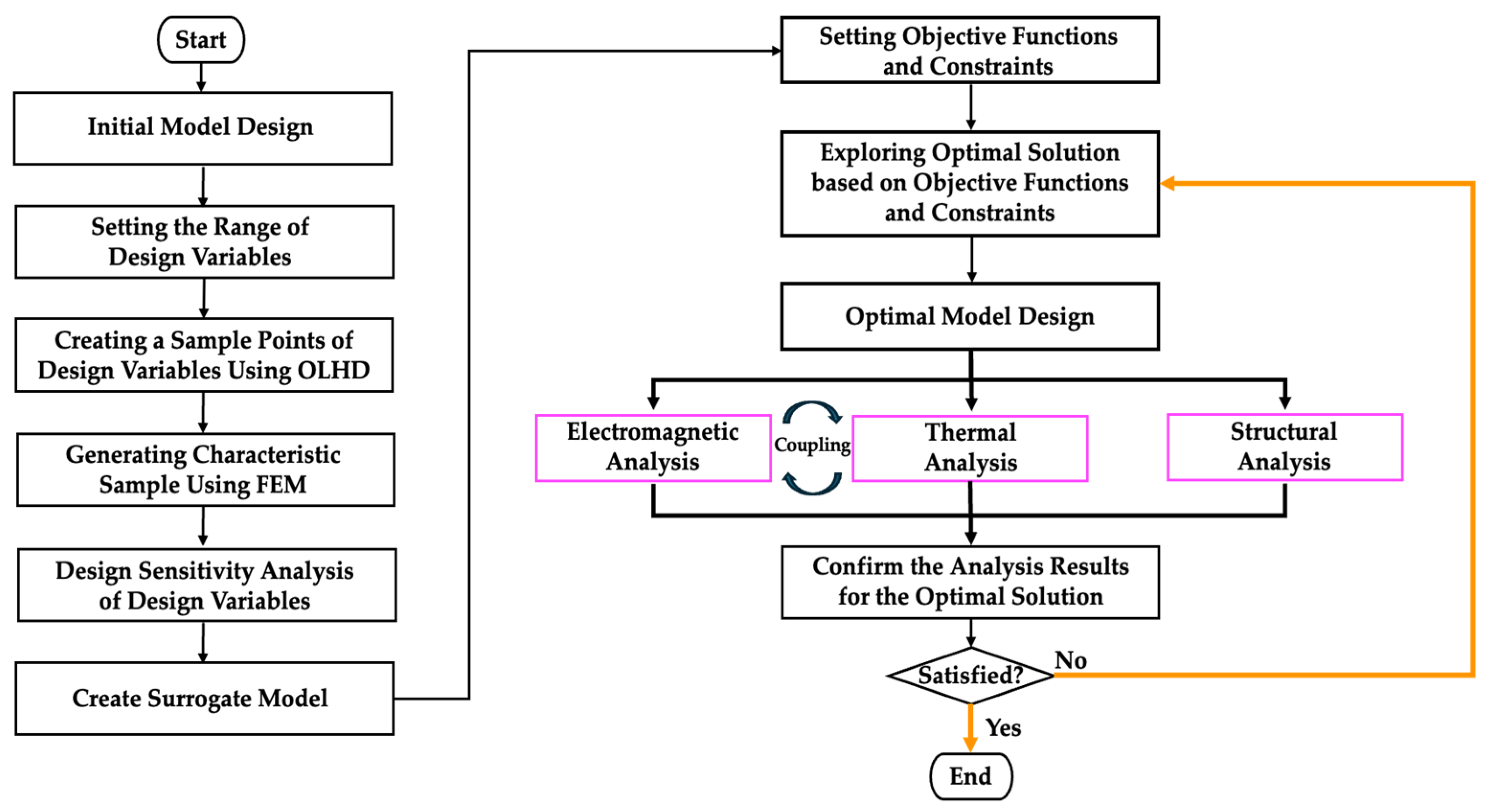 The optimal design process begins with the initial CMG design, followed by the selection of appropriate design variables and the specification of their feasible ranges. Sampling points within these ranges were generated using OLHD, a DOE technique that provides superior space-filling properties. Each sampling point was evaluated using three-dimensional FEM to obtain electromagnetic performance data, while a design sensitivity analysis was conducted in parallel to quantify the influence of each design variable on key output characteristics. Based on these analyses, the objective function and design constraints for the optimal design problem were defined.