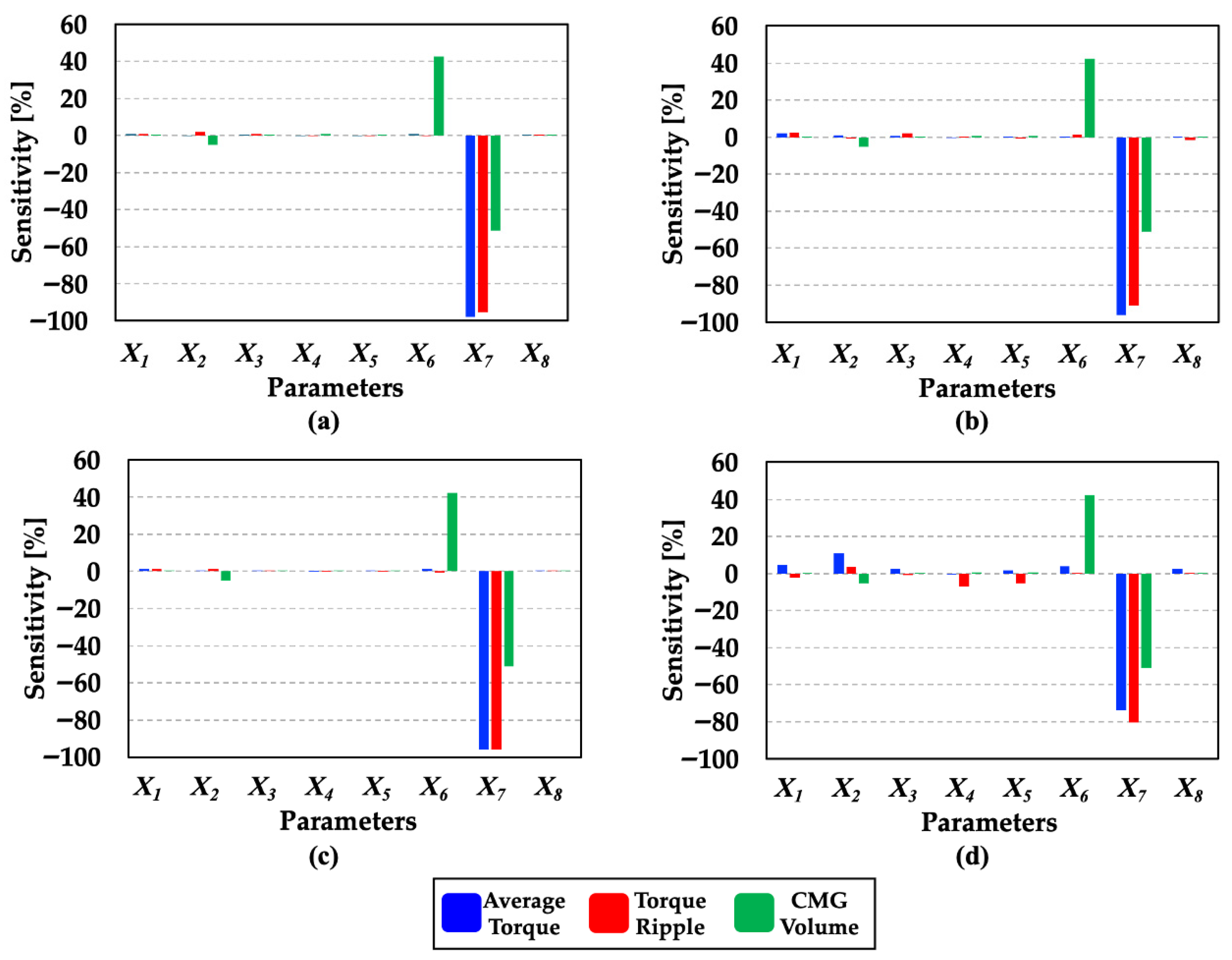Among all design variables, (outer radius) exhibited the highest sensitivity, accounting for more than 40% of the total influence in all four CMG models. This result indicates that the outer radius has a dominant effect on the overall CMG volume and, consequently, on torque density.